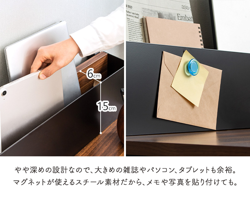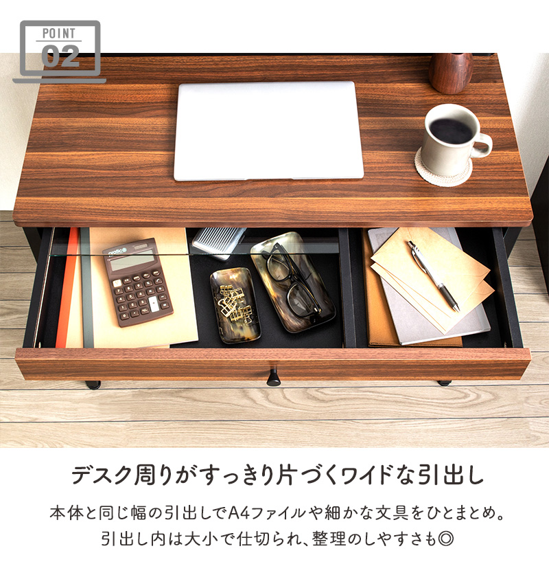 ウッド&スチールの重厚で温かみのある表情にコンパクトながらも収納力のあるパソコンデスク「ナッツ」。幅85cmで省スペースでも使用できるコンパクトなサイズ感。本体と同じ幅の引出しとブックシェルフで雑貨や小物はもちろん、A4サイズよりも大きな雑誌やノートパソコン、タブレットもおしゃれに収納でき、デザイン性と機能性を両立。フレームは丈夫なスチールに粉体塗装仕上げを行い、サビや汚れに強くきれいな状態で永くお使いいただけます。