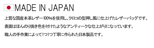 上質な国産本革レザー100%を使用し、クロコの型押し風に仕上げたレザーバックです。表面はほんのり焼き色を付けたようなアンティークな仕上げになっております。職人の手作業によって1つ1つ丁寧に作られた日本製品です。