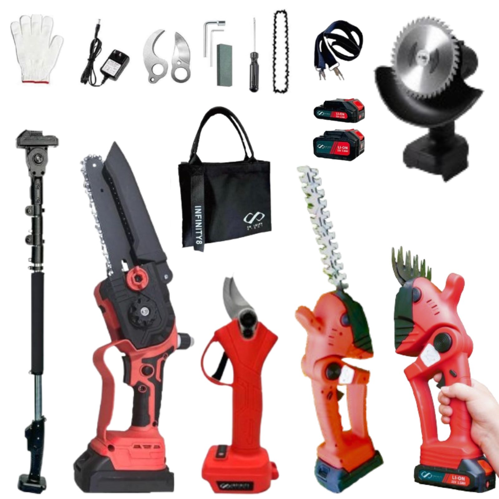 延長ポール×1 (約1.45kg)、6寸チェーンソー×1 (約0.8kg)、電動ハサミ×1 (0.6kg)、草刈り機×1、ヘッジトリマー×1、バリカン×1、1.5Ahバッテリー×1 (約0.3kg/個)、3.0Ahバッテリー×1 (約0.6kg/個)、充電器×1、替えチェーン×1、ハサミ替え刃×1、収納バッグ×1、ベルト×1、手袋×1、内六角レンチ×1、ドライバー×1、六角レンチ×1、ミニ砥石×1。