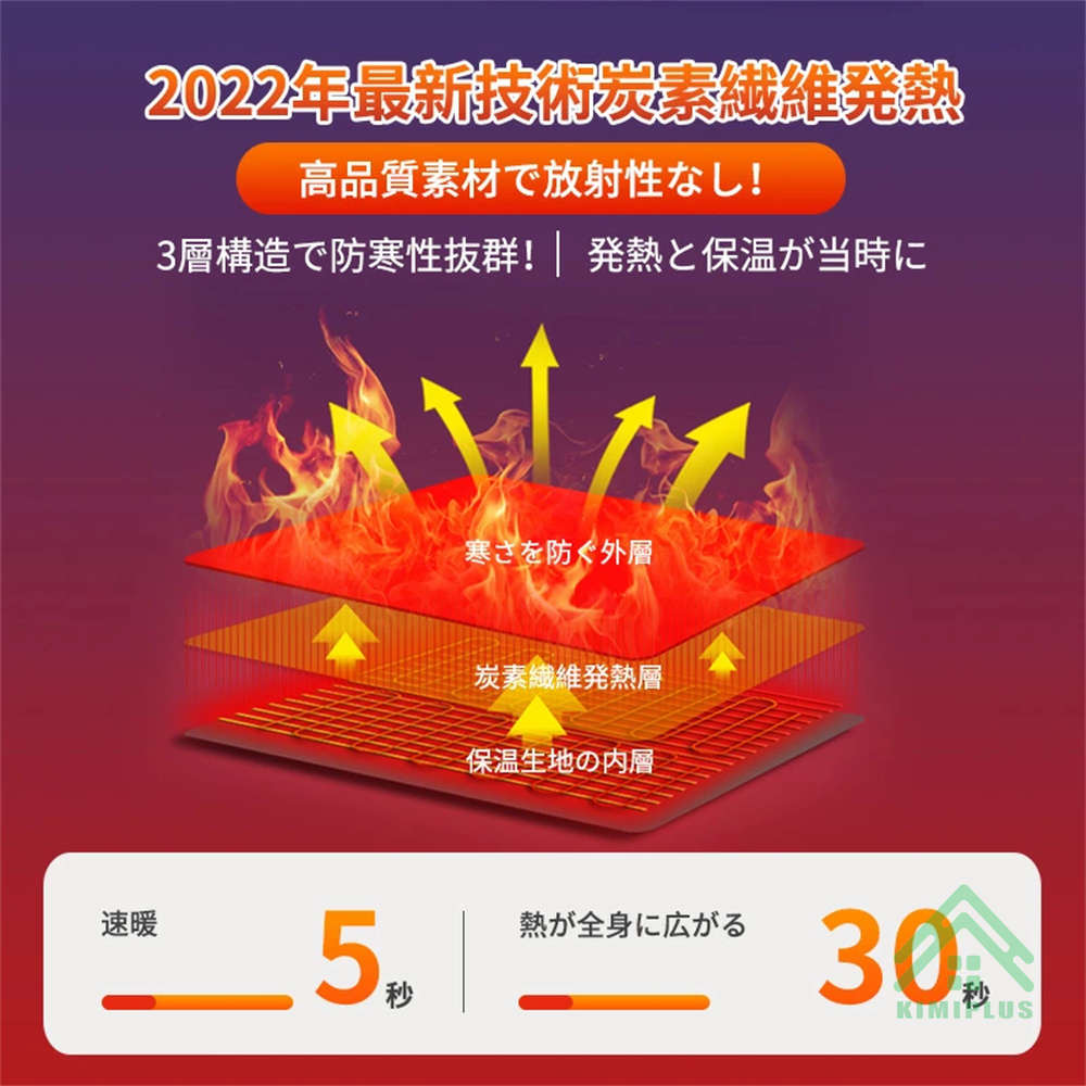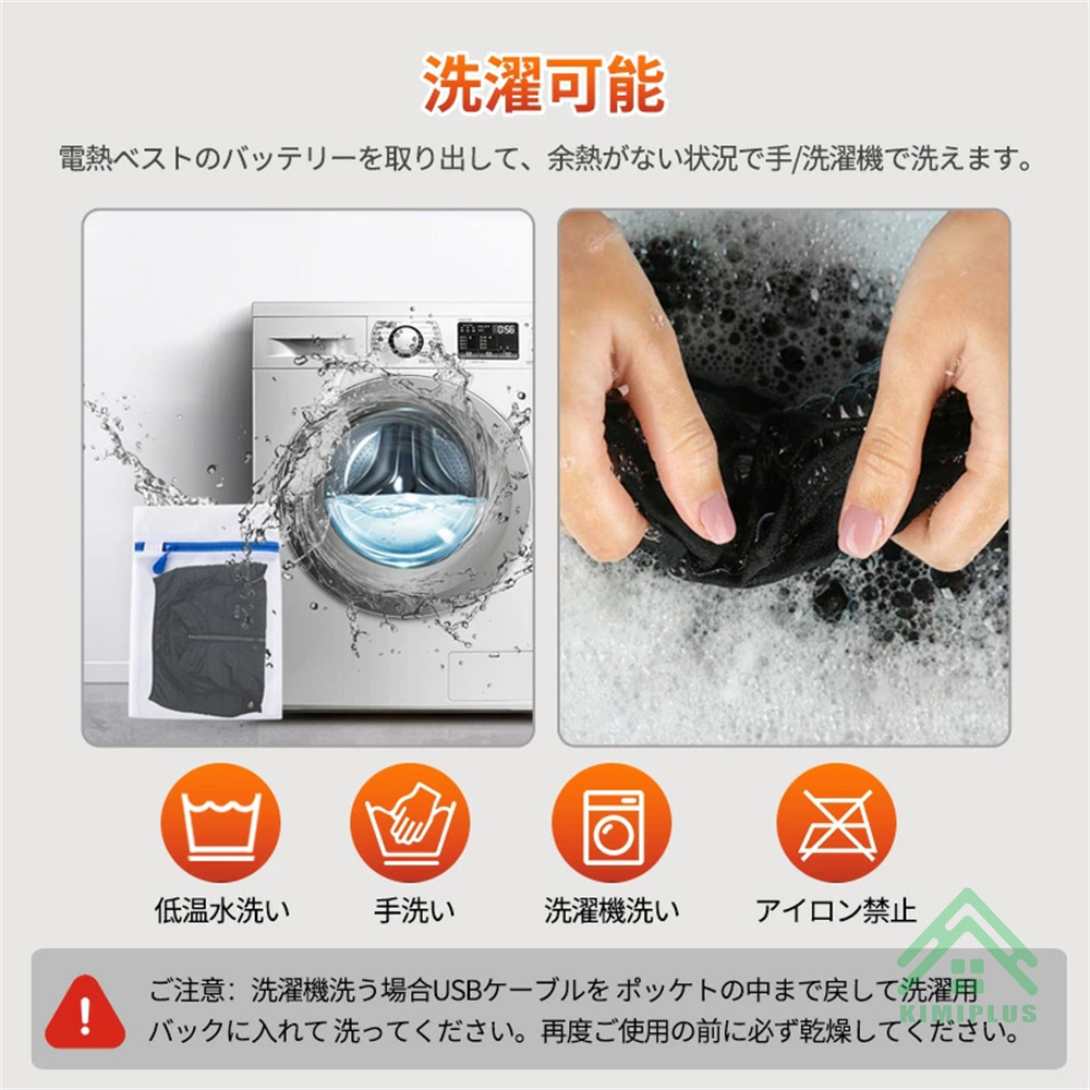 日本製グラフェン繊維ヒーターを採用し、電源を入れた後、約5秒ぐらい温まり始め、1分間ほど暖かさが広がります。加熱ベストの中身には中綿入り、ヒーターとの組み合わせで熱を逃さず、重ね着では得られない確実な暖かさを与えます。汚れたら、モバイルバッテリーを外して、手洗いや洗濯機でも洗えて、いつも清潔にご愛用いただける防寒ジャケットです。