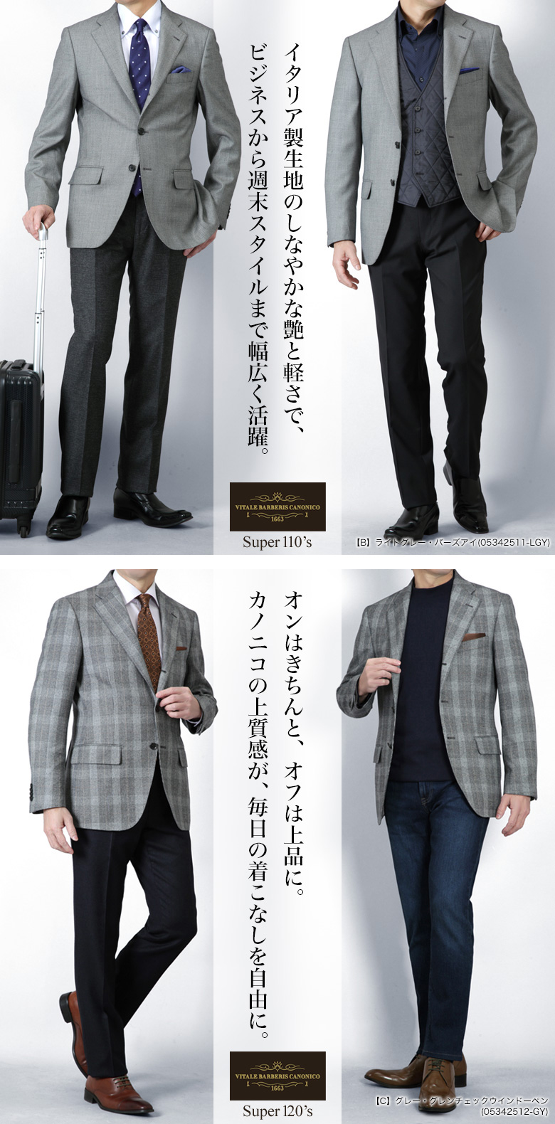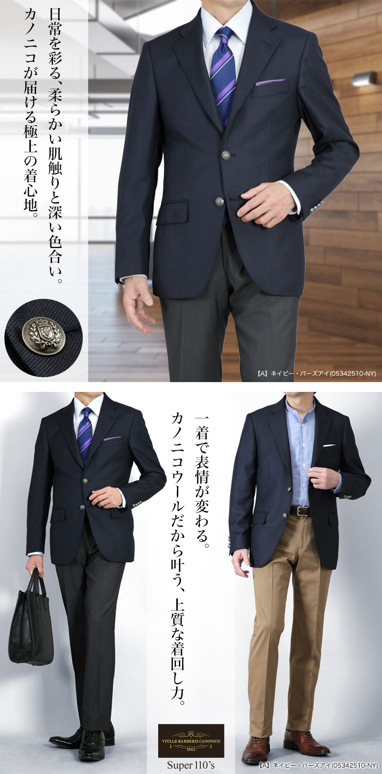 上質なイタリア製 CANONICO(カノニコ)ウール100%生地 を贅沢に使用した、品格と機能性を兼ね備える 段返り3つボタンジャケット。カノニコならではの しなやかな肌触り・軽やかな着心地・深みのある発色 が特徴で、ビジネスからジャケパンまで上質な大人のスタイルを演出します。段返り3つボタンは、第一ボタンがラペルに隠れるクラシックなデザインで、Vゾーンが自然に美しく開き、落ち着いた貫禄とスマートなシルエットを実現。フォーマルすぎず、かつ崩れすぎない絶妙なバランスが魅力です。CANONICOの生地は、細番手の糸を使用することで生まれる 滑らかな質感と上品な光沢 がポイント。高級スーツ生地として世界中で評価されるその品質は、着るだけで“良いものを纏っている”ことを実感できます。カラーは ネイビー・グレー・グレンチェックの3色展開。どれも大人のワードローブに馴染み、幅広いコーディネートで活躍します。