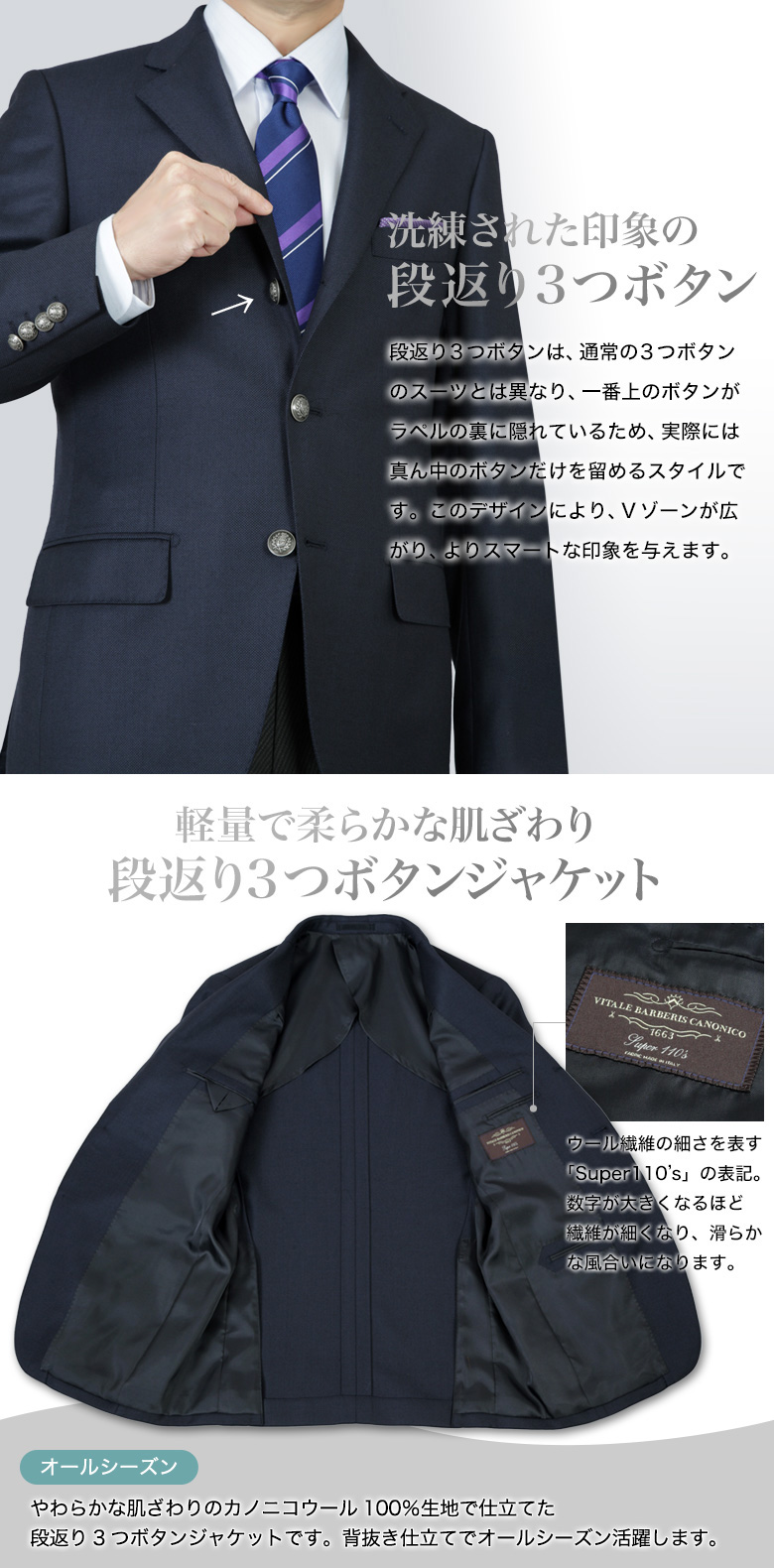 【イタリア製CANONICO生地・段返り3つボタンウールジャケット】