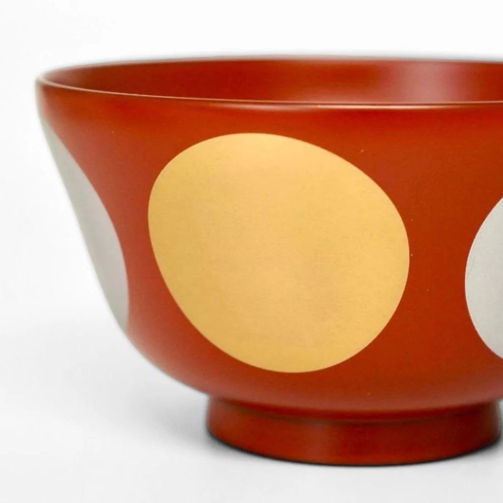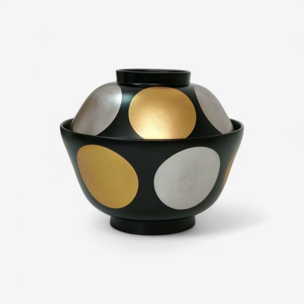 太陽と月を表す日月文様がデザインされた越前塗の蓋付椀。