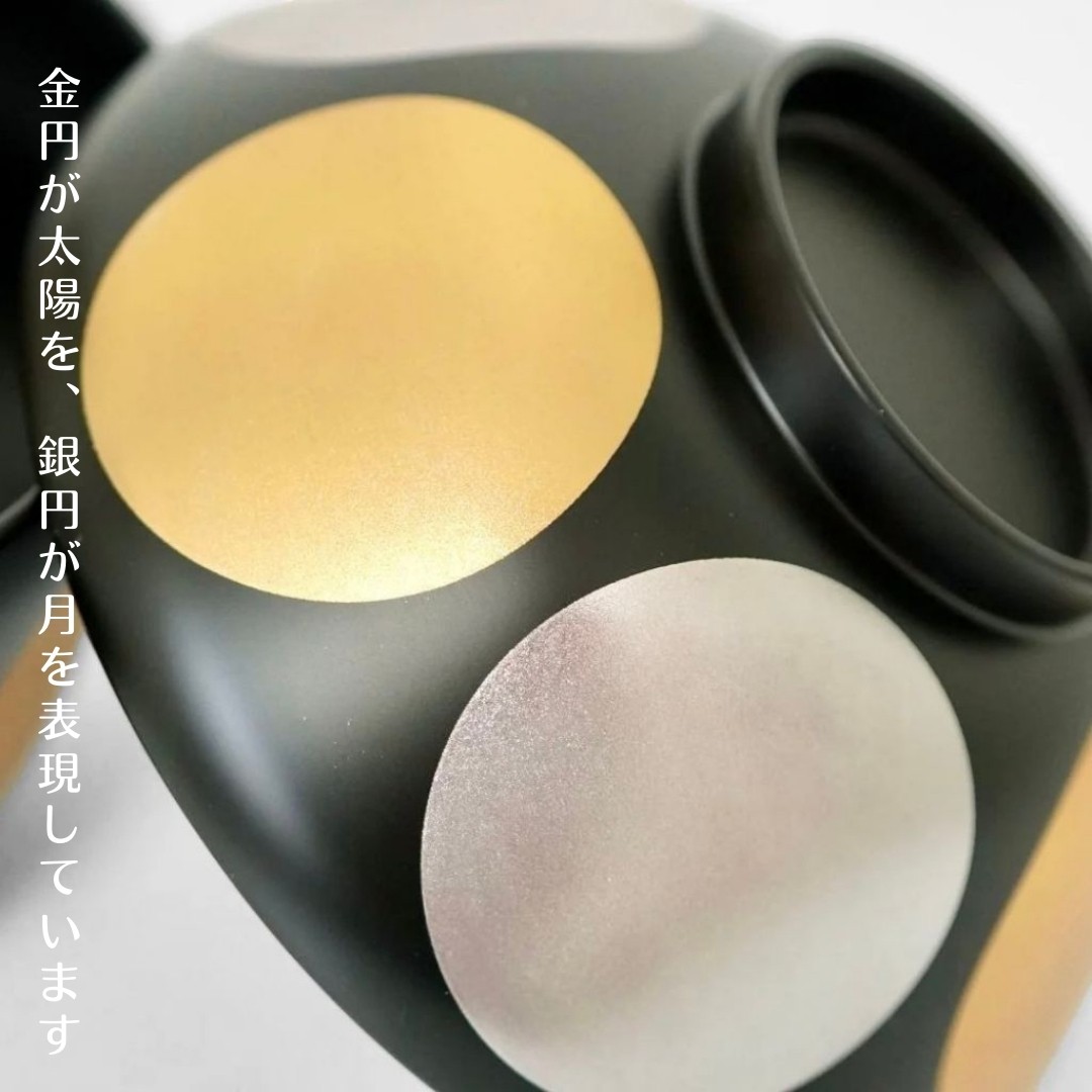 シンプルなデザインながら、金銀で表現された日月文様が上品さと存在感を放ち、和洋問わずお使いいただけるモダンな器です。