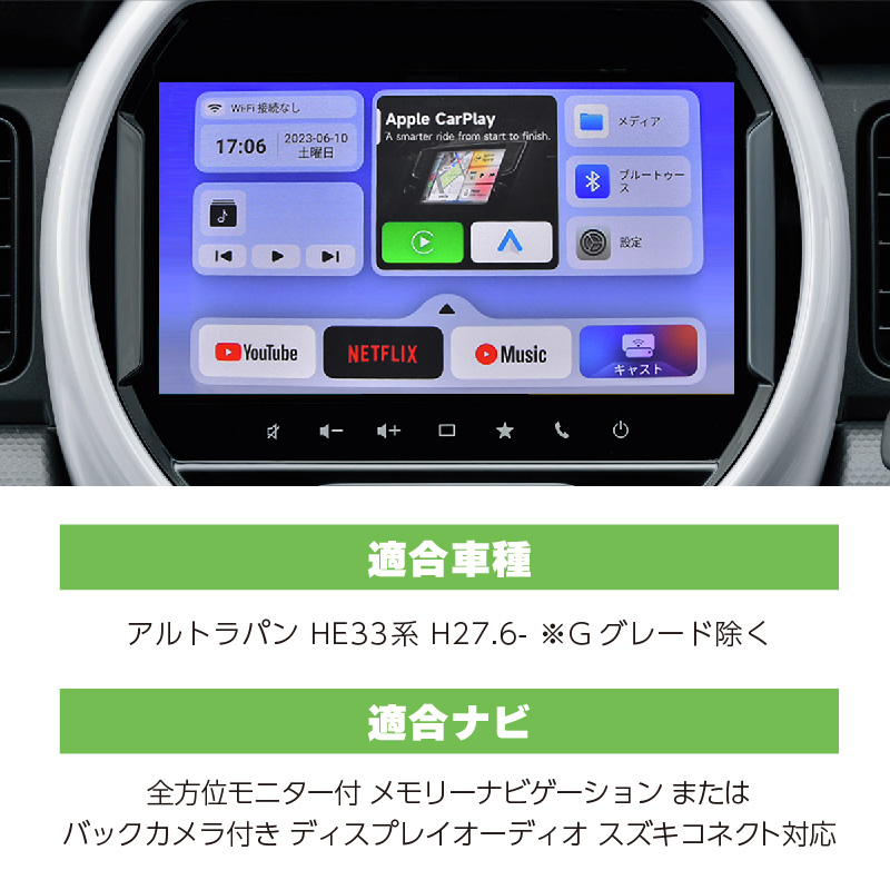 スズキ アルトラパン HE33系 HE33S carplay ワイヤレス 純正ナビ カープレイ AndroidAuto iphone 車で動画 youtube Netflix 車でユーチューブを見る 車でyoutubeを見る 機器 ミラーリング アンドロイド Bluetooth 車で動画が見放題