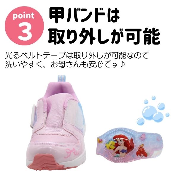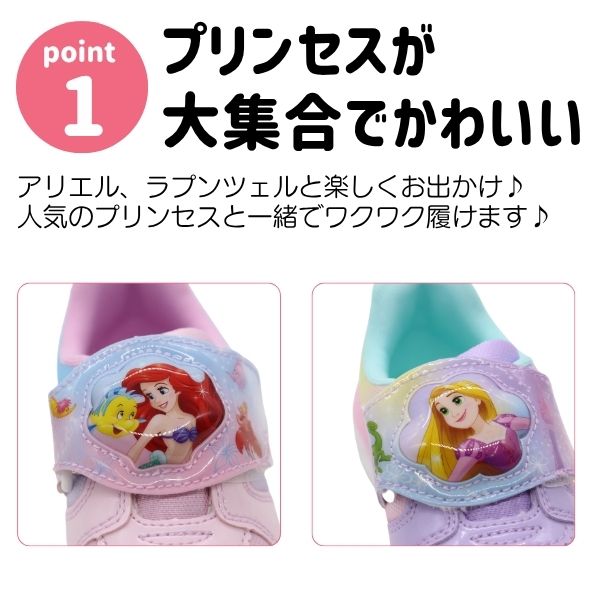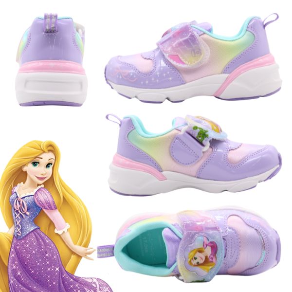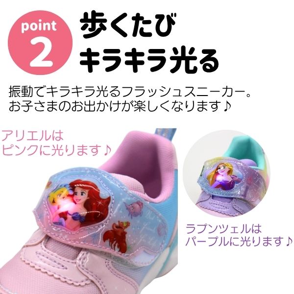 「ラプンツェル」 「アリエル」 のお姫様がデザインされた人気のシューズです。甲バンドのには、歩くたび光るフラッシュアイテムが♪お出かけが楽しくなる一足です。 爆買