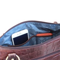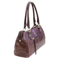 美しい陰影が魅力の華やかなクロコ型押し素材に、意外にたっぷり入る収納力、又肩にかけられる絶妙な持ち手長さが魅力のポイント。