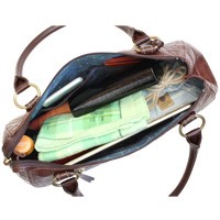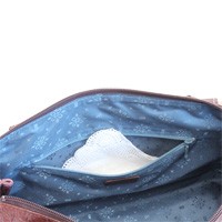 光りすぎず、程よい落ち着きのつや感が革らしさを高め、ミルクチョコレートのような深みのあるお色です。 ムラを出した染め感が、型押しの奥深さを増しており、一つ一つ違う表情に合わせやすくも個性が愛おしくなるお色です。ステッチは薄いベージュ、金具部はアンティークゴールド色、内装はブルーの撥水ジャガード生地で落ち着いた印象です。