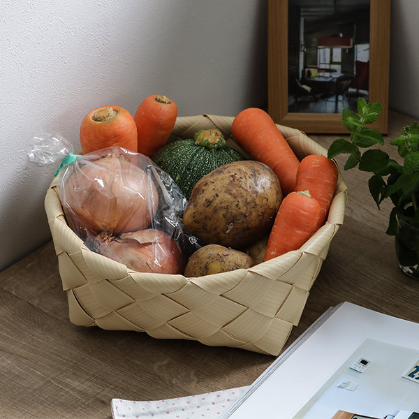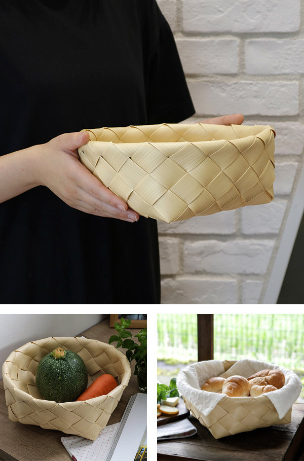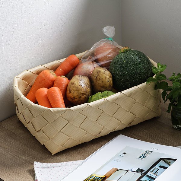 食品検査適合済みで、食品に悪影響を及ぼす有害物質は含まれていないことが証明されているので、野菜やパンなど口にするものを、直接かごに入れられます。キッチンクロスなどを組み合わせると、お洒落に演出できます。