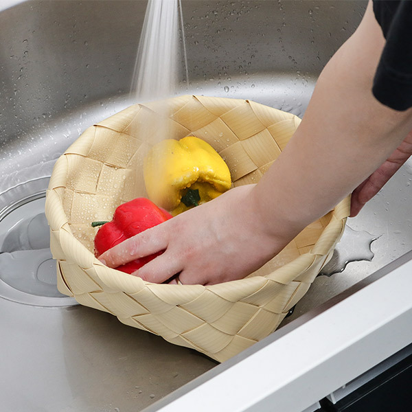 しなやかな質感はまるで天然素材のようなポリプロピレン製のマルチバスケットです。水洗いして水切りしたお野菜をそのまま保管したり、食卓ではパン用のバスケットとしてもお洒落に盛り付けられるサイズ感です。