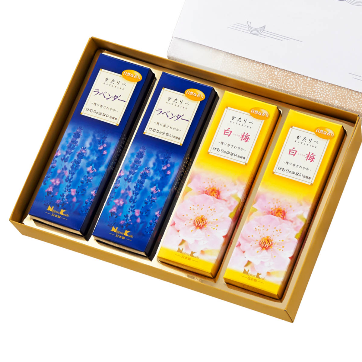 線香 贈答用 かたりべ ラベンダー 白梅 進物 4箱入り 包装品 ( お線香 線香セット 進物線香 進物用 煙少なめ 喪中見舞い お供え 法事 仏壇 お墓参り )