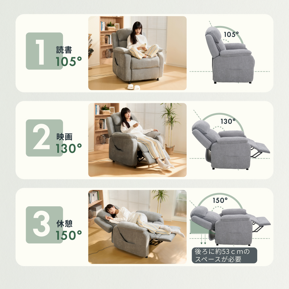 ・無重力ポジション付き:ワンタッチ式で簡単操作!最大150°まで調節でき、無重力ポジションで体圧を分散して負担を軽減。長時間のリラックスタイムも快適に過ごせます。