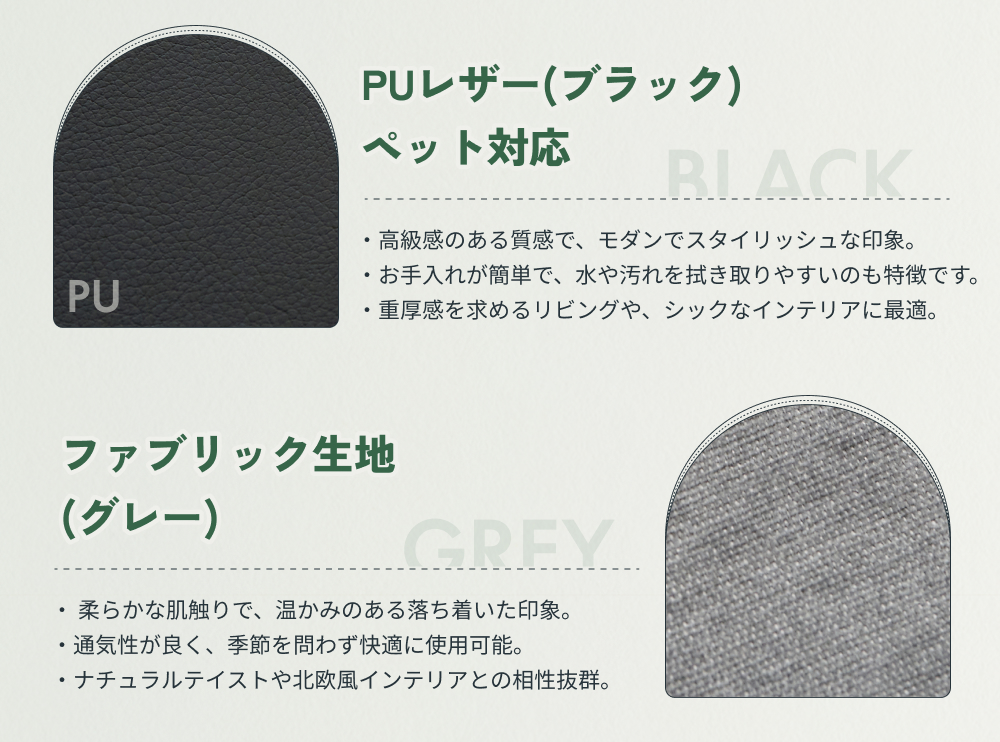・材質:{張り材}グレー:ポリエステル ブラック:PUレザー、{クッション材}ウレタンフォーム、ポリプロピレン、鋼製ばね、{構造部材}スチール