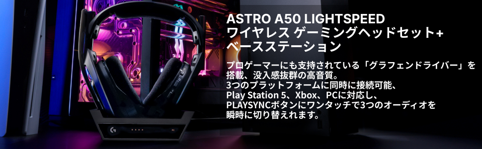 ASTRO A50 (GEN 5) LIGHTSPEED ワイヤレスゲーミングヘッドセット+ベースステーションは、グラフェンドライバーを搭載した超高音質のMixAmp内蔵ヘッドセットです。