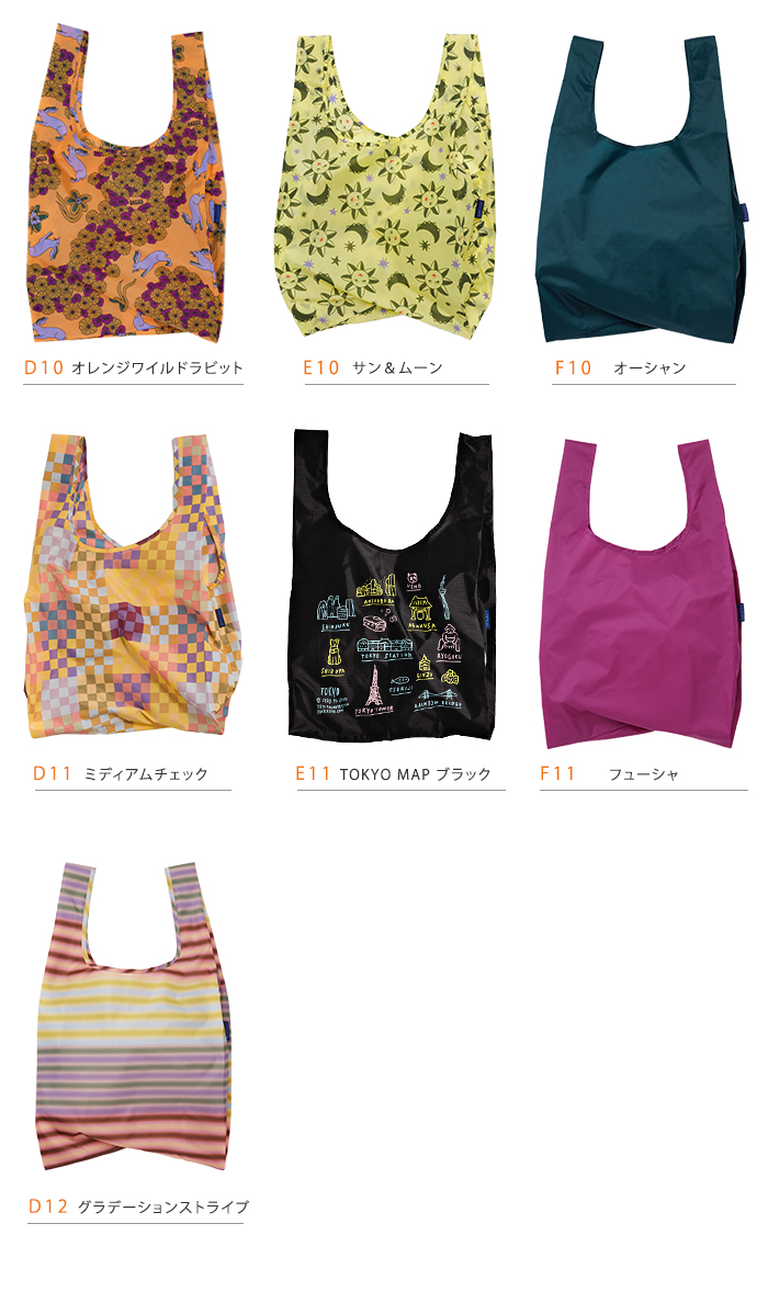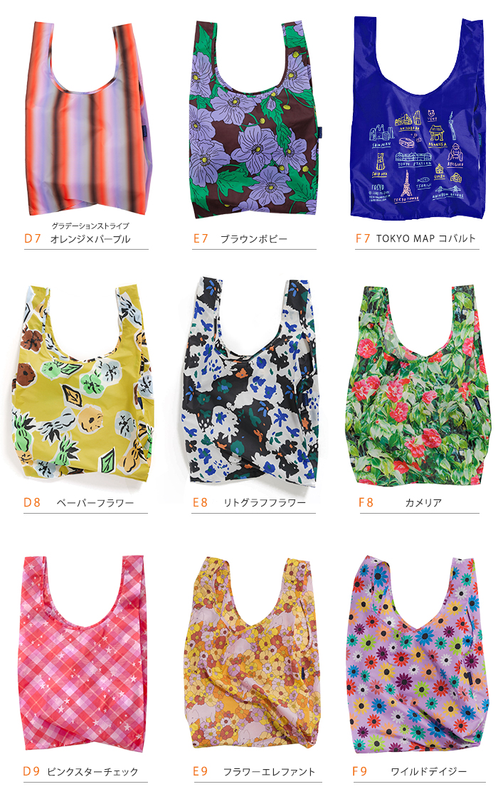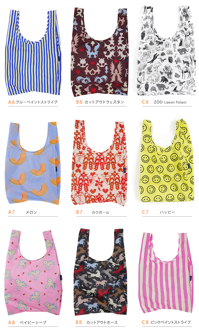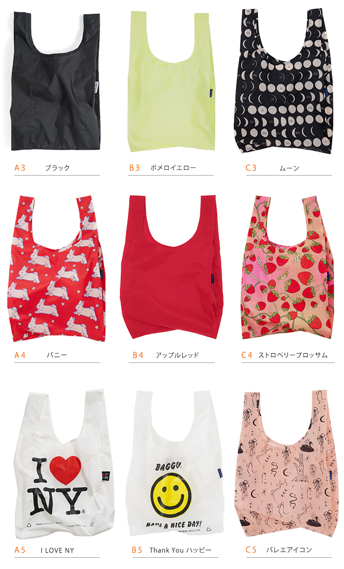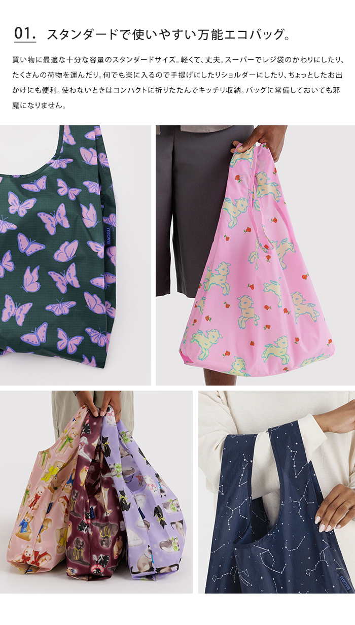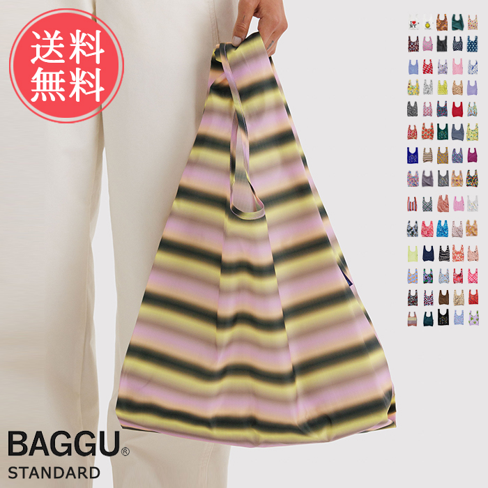 2025 新柄入荷。BAGGUの定番サイズ。100%リサイクル素材で地球に優しい。耐荷重15kgの頼れるエコバッグ。豊富なデザインから選べます。