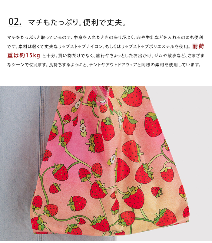 買い物に最適な十分な容量のスタンダードサイズ。軽くて、丈夫。スーパーでレジ袋のかわりにしたり、たくさんの荷物を運んだり。何でも楽に入るので手提げにしたりショルダーにしたり、ちょっとしたお出かけにも便利。使わないときはコンパクトに折りたたんでキッチリ収納。バッグに常備しておいても邪魔になりません。マチをたっぷりと取っているので、中身を入れたときの座りがよく、卵や牛乳などを入れるのにも便利です。素材は軽くて丈夫なリップストップナイロンを使用。耐荷重は約10〜15kgと十分。買い物だけでなく、旅行やちょっとしたお出かけ、ジムや散歩など、さまざまなシーンで使えます。長持ちするようにと、テントやアウトドアウェアと同様の素材を使用しています。