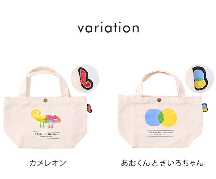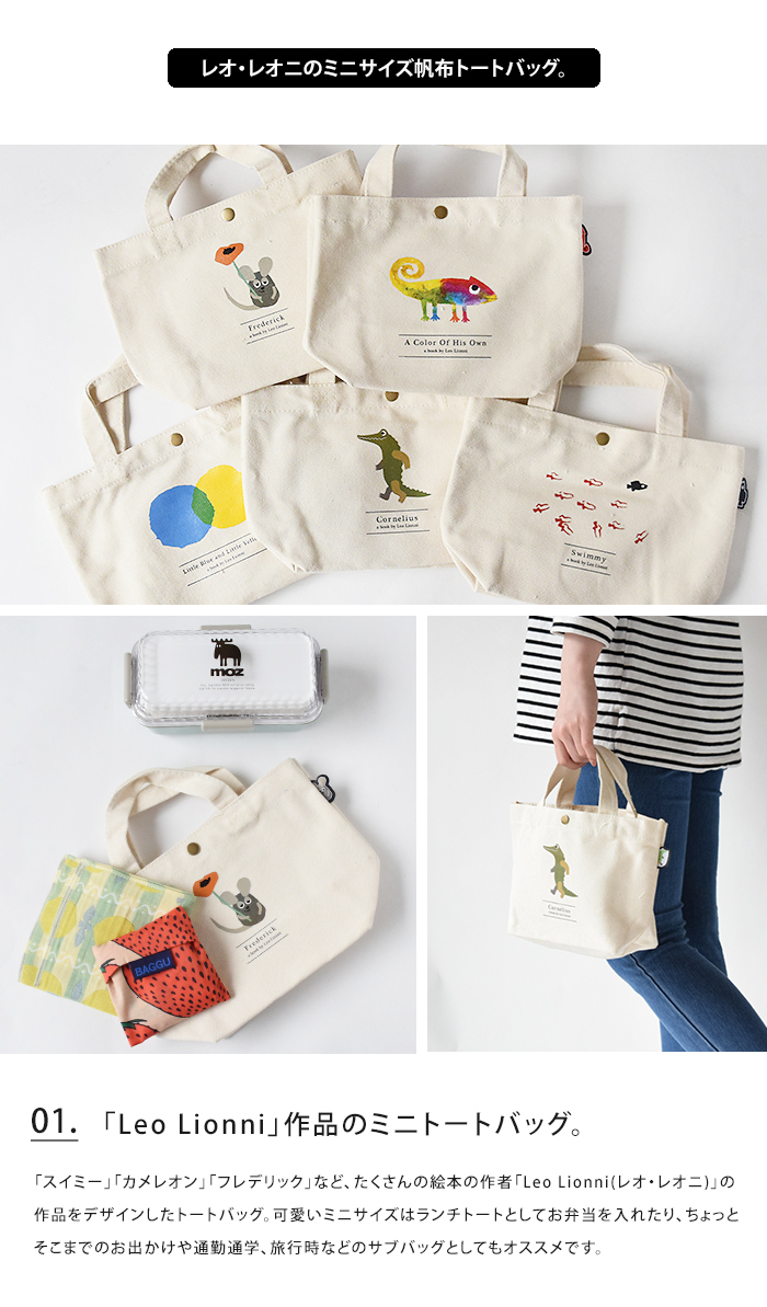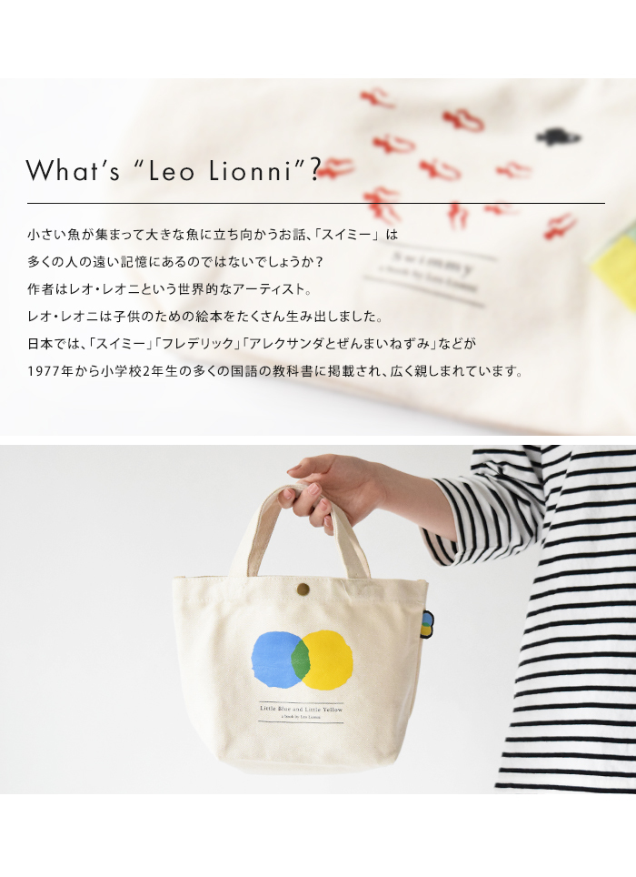 「スイミー」「カメレオン」「フレデリック」など、たくさんの絵本の作者「Leo Lionni(レオ・レオニ)」の作品をデザインしたトートバッグ。可愛いミニサイズはランチトートとしてお弁当を入れたり、ちょっとそこまでのお出かけや通勤通学、旅行時などのサブバッグとしてもオススメです。内側にはポケットがあり、ちょっとした小物の整理に便利。開口部はボタン付きで荷物の飛び出しを防いでくれます。