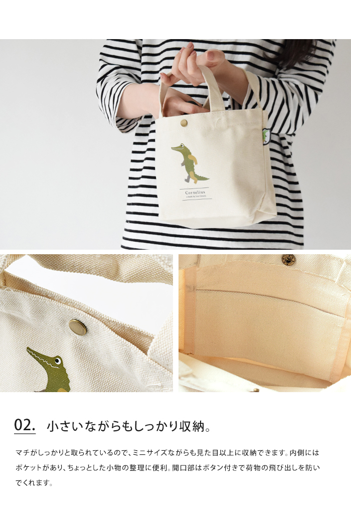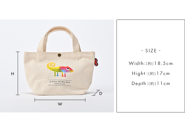「スイミー」「カメレオン」「フレデリック」など、たくさんの絵本の作者「Leo Lionni(レオ・レオニ)」の作品をデザインしたトートバッグ。可愛いミニサイズはランチトートとしてお弁当を入れたり、ちょっとそこまでのお出かけや通勤通学、旅行時などのサブバッグとしてもオススメです。マチがしっかりと取られているので、ミニサイズながらも見た目以上に収納できます。内側にはポケットがあり、ちょっとした小物の整理に便利。開口部はボタン付きで荷物の飛び出しを防いでくれます。