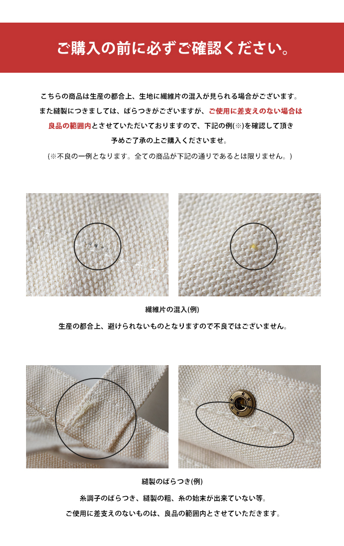 生産の都合上、生地に繊維片の混入が見られる場合がございます。また縫製につきましては、ばらつきがございますが、ご使用に差支えのない場合は良品の範囲内とさせていただいておりますので、予めご了承の上ご購入くださいませ。