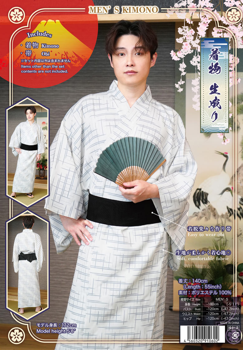 生成り(きなり)に灰色の格子柄が入った着物に黒色の帯を合わせたメンズ着物です。