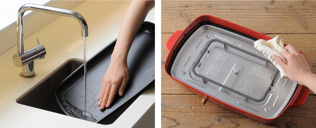 プレートはお手入れしやすいフッ素樹脂コーティングで焦げ付きにくく、サッと洗い流すことができます。本体はタオルで拭いてお手入れできるので清潔に使用できます。