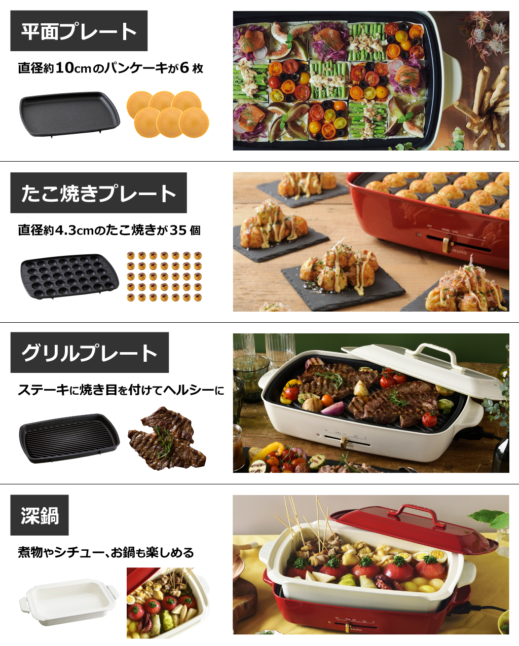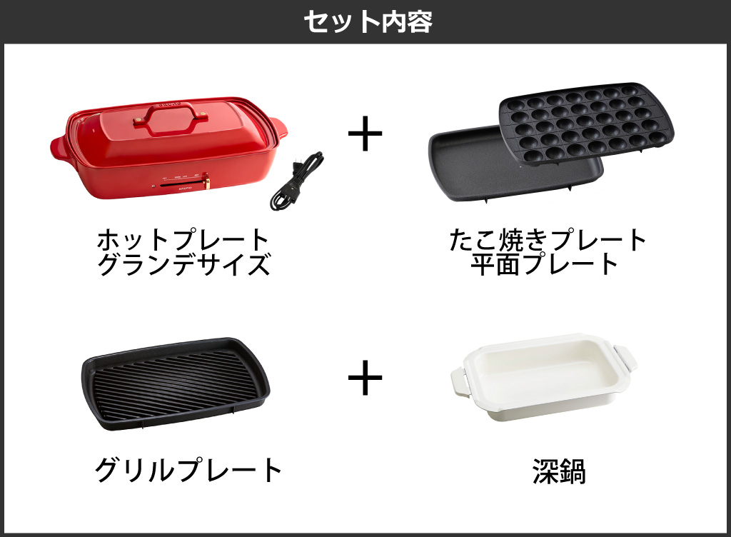 平面プレートとたこ焼きプレートの2種類のプレートが付属しています。 本ページは、更にグリルプレートと深鍋がセットに。前菜からメイン、お鍋、デザートまで幅広く調理ができ、料理のレパートリーが広がります。