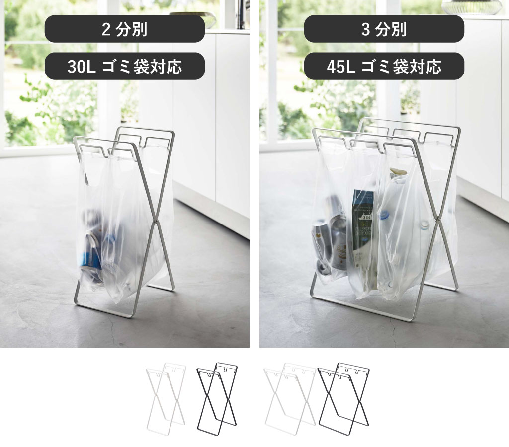 ゴミ箱はそれぞれ2分別、3分別に対応。フレーム全体を使えば30L、45Lゴミ袋を掛けて、大容量のゴミ箱として使用できます。フックが付属しているので、小物を引っ掛ける時に活用したり、ゴミ袋の袋止めとして使用できます。