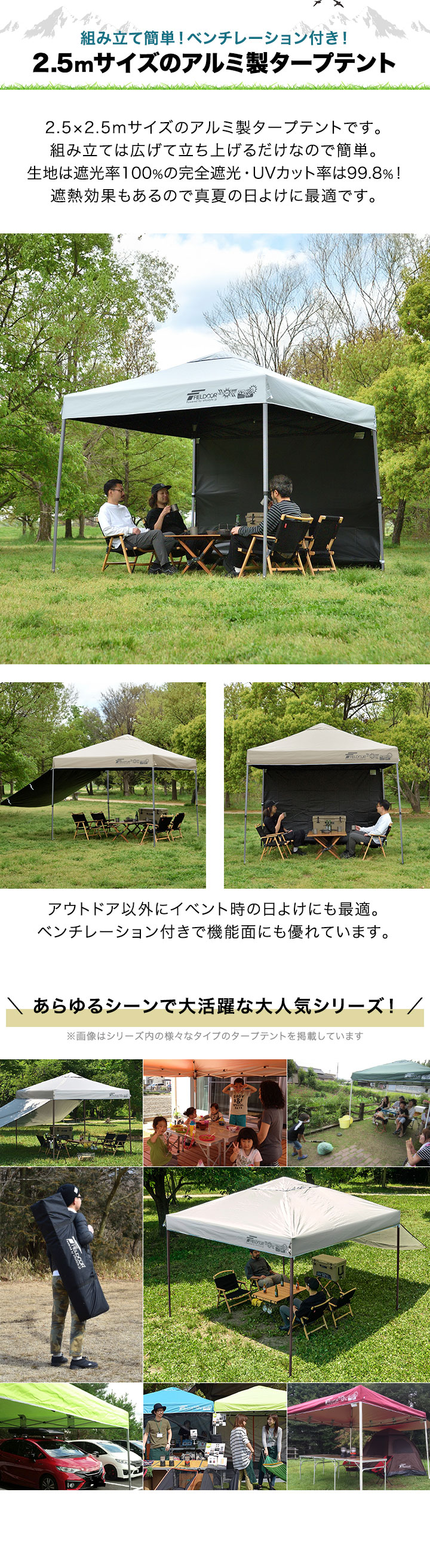 ワンタッチタープテント 2.5m×2.5m 横幕 サイドシート1枚付き 軽量アルミ 遮光/遮熱/UVカット FIELDOOR テント タープ 250 大型 簡単 1年保証 送料無料