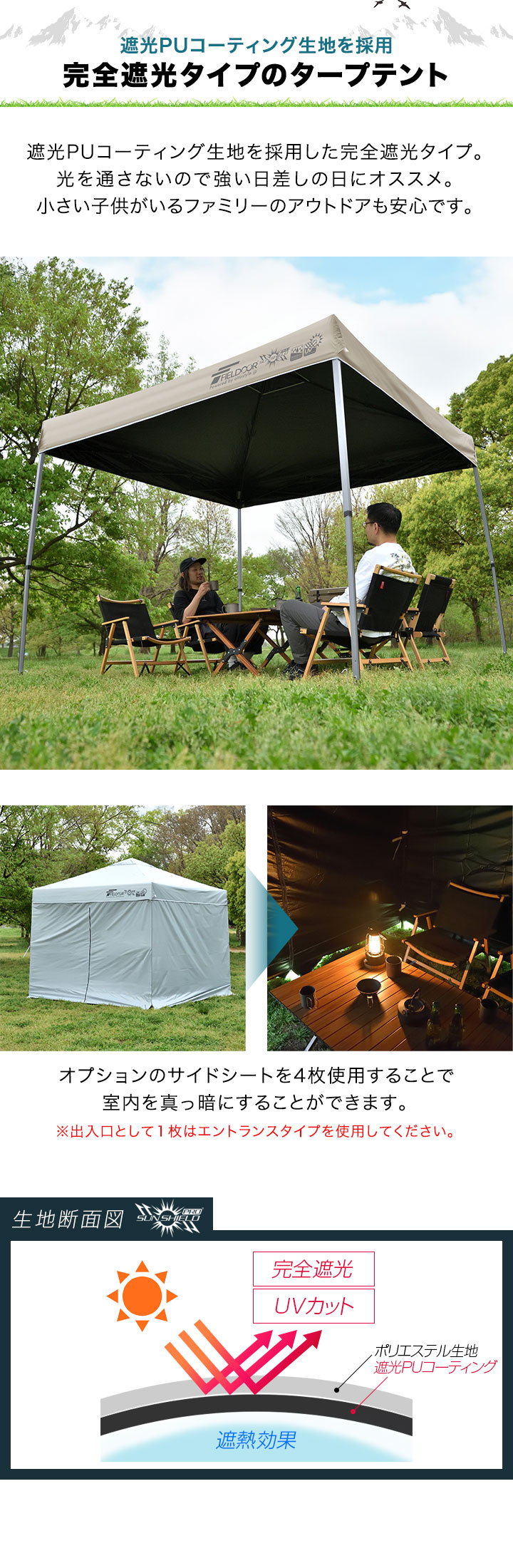 強い日差しから守る!遮光/遮熱に優れた自立式タープ