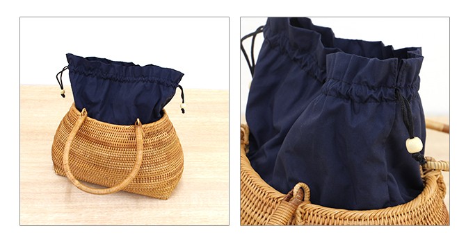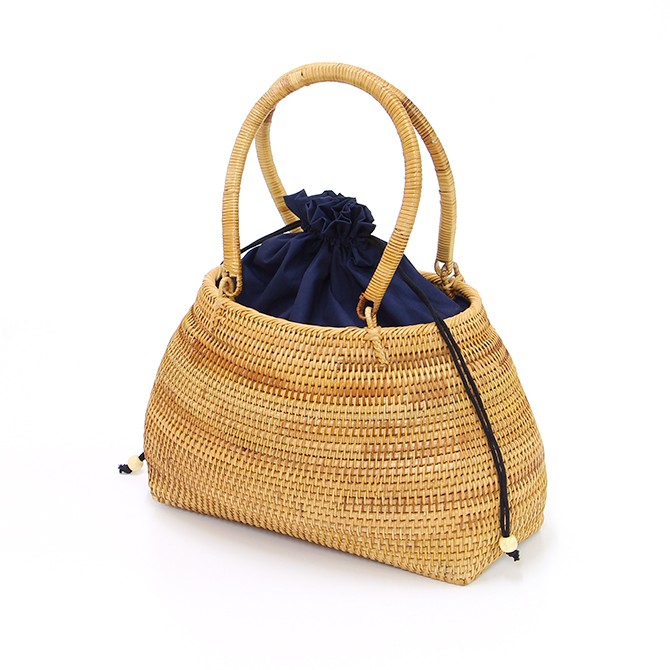 ベトナムラタン製 アジアン ふっくらフォルムかごバッグ 巾着付き /ベトナム カゴバッグ アジアン カゴバッグ 浴衣 着物