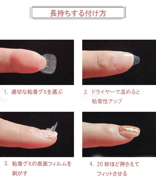 (2)粘着グミタイプ:適切なサイズの粘着グミを爪に貼り、表面フィルムを剥がす