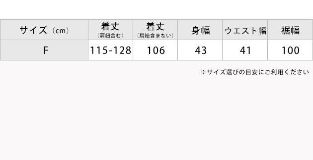 【F】着丈(肩紐含む)115-128/着丈(肩紐含まない)106/身幅43/ウエスト幅41/裾幅100