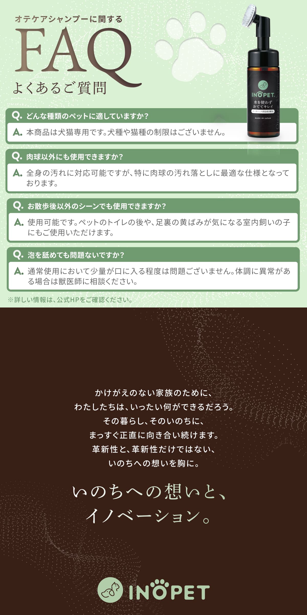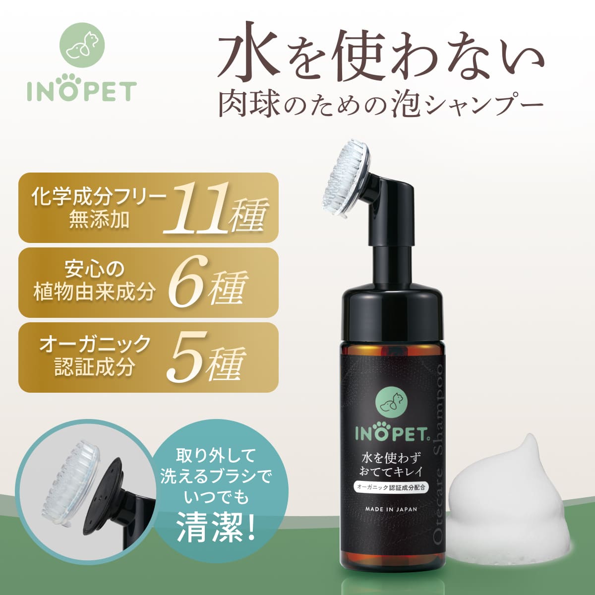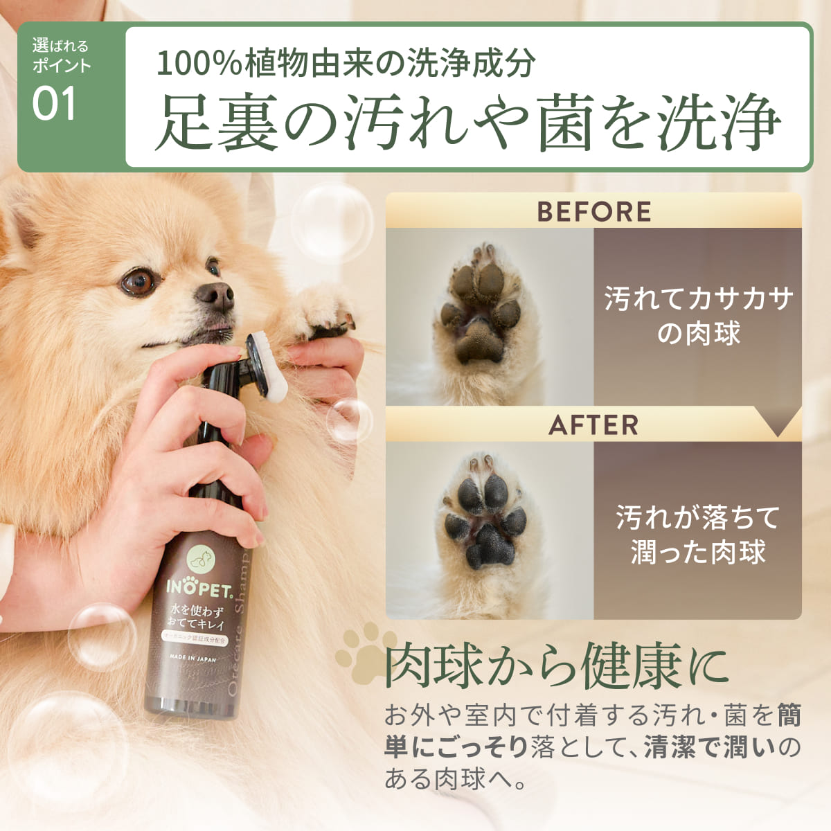 INOPET【タオルなしタイプ】 獣医師推奨 オーガニック 肉球 足裏 クリーナー 手足用 泡シャンプー 洗い流し不要 無添加 無香料 植物由来 舐めても安心 150ml
