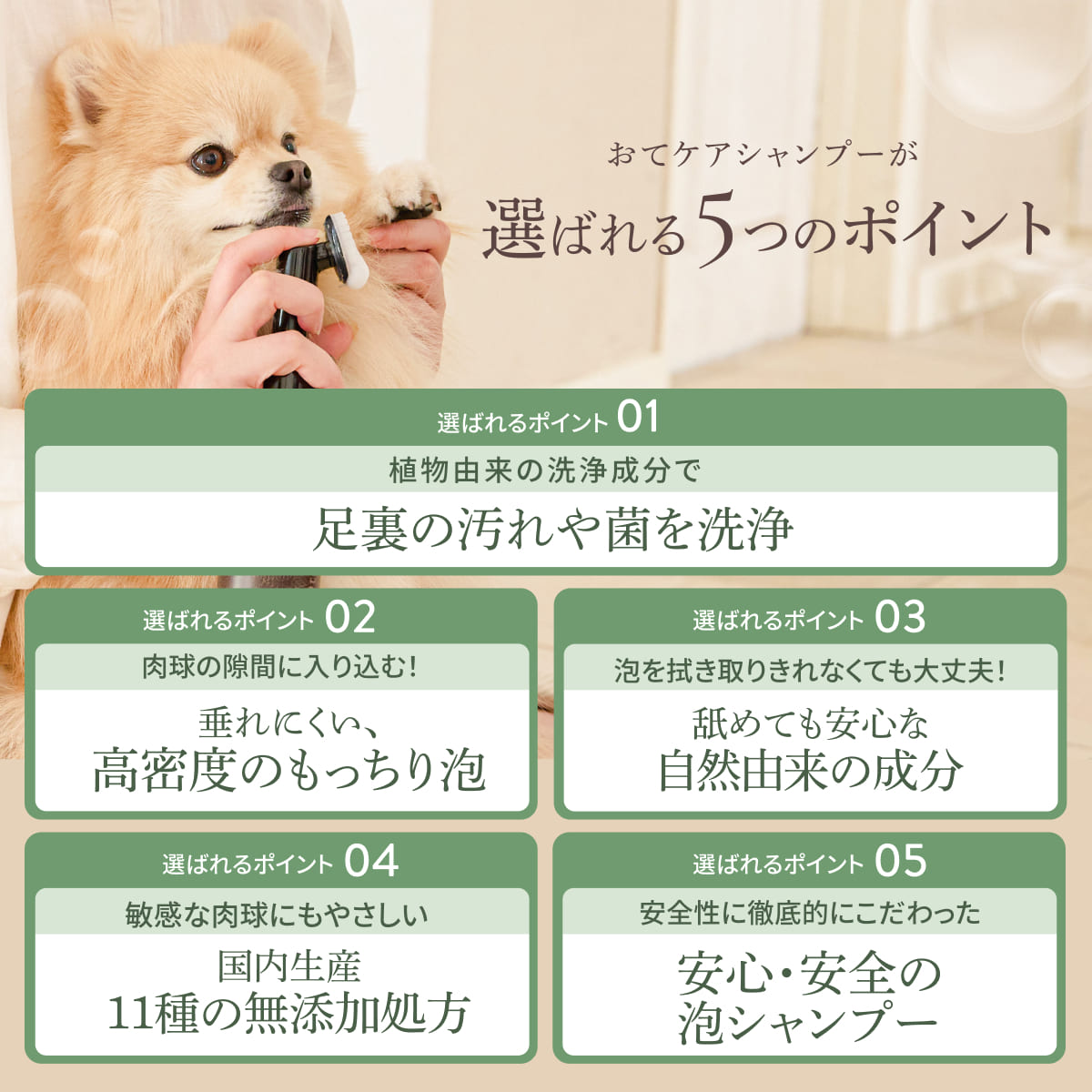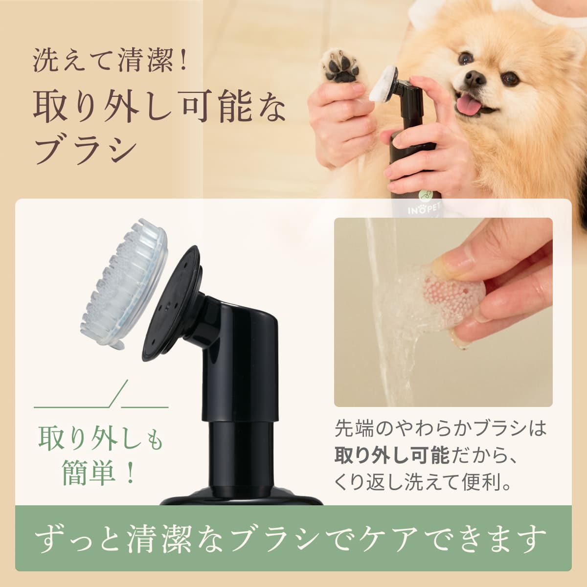 高密度の泡が肉球の間に入り込んでしっかり洗浄。やわらかブラシで肉球に負担を掛けずに使えます。ブラシは取り外し可能だから洗えてずっと清潔!