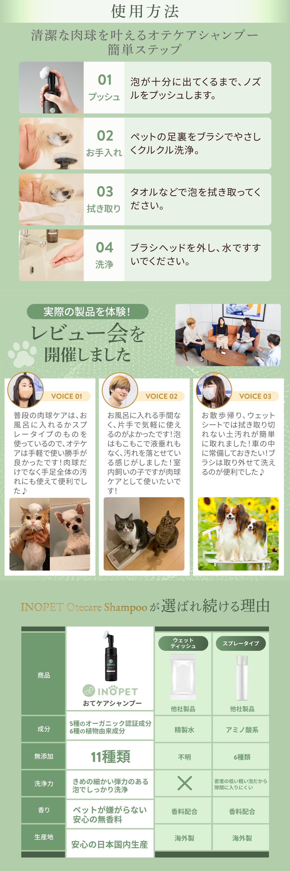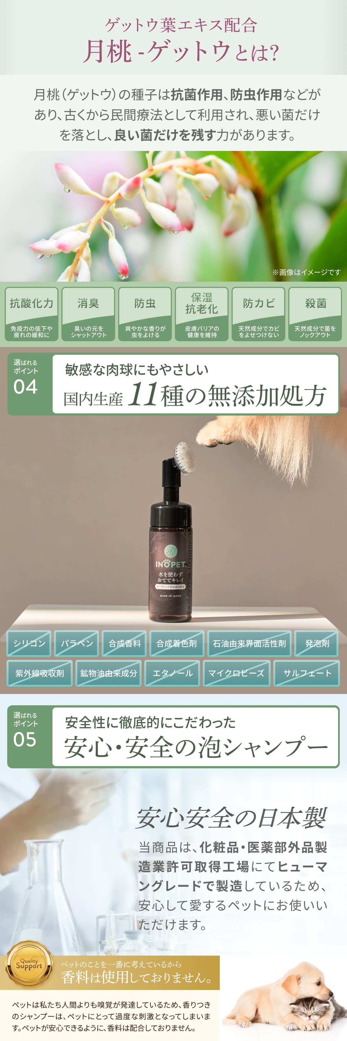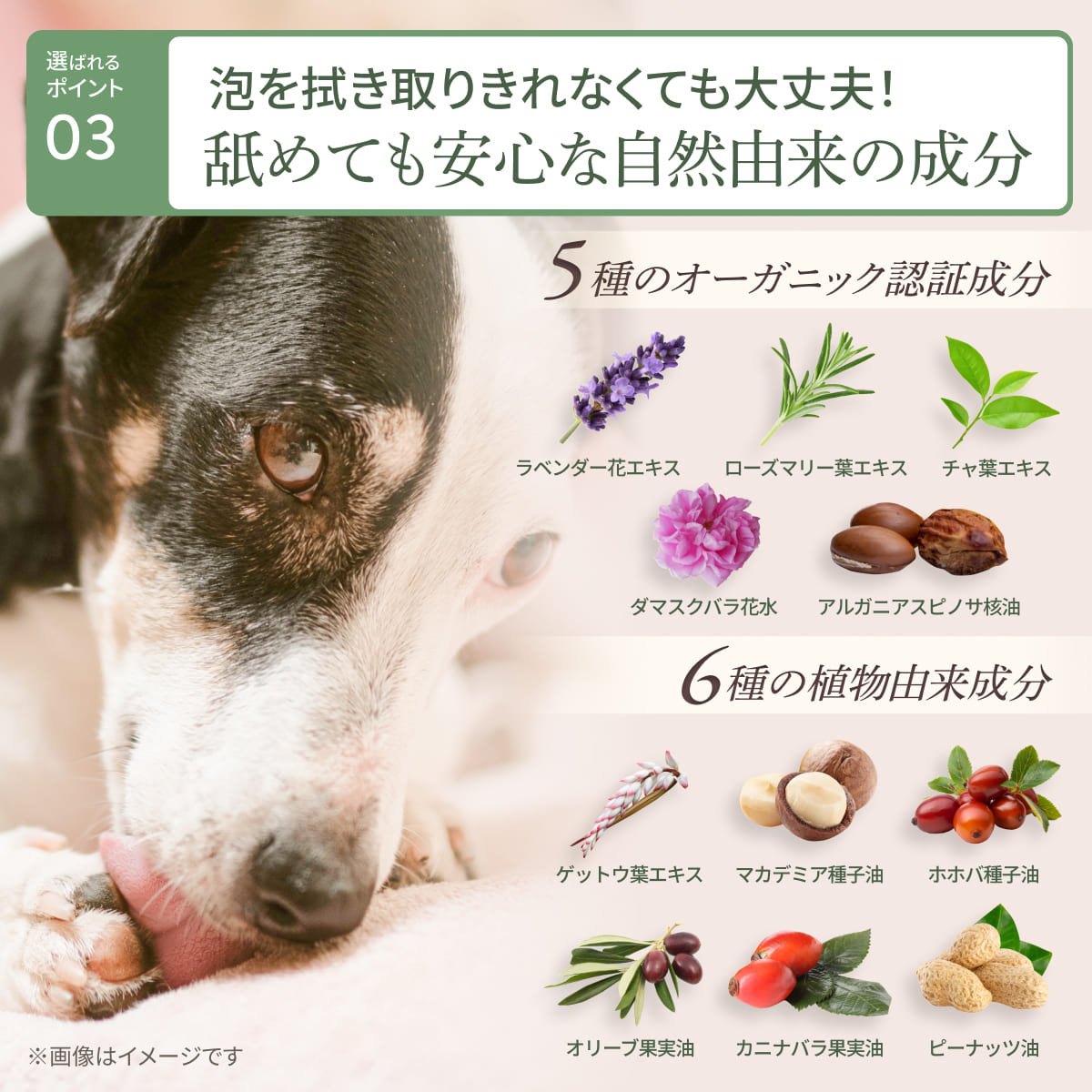 オーガニック認証成分5種配合、植物由来成分6種配合、11種の無添加で拭き取り切れなくても大丈夫。国産だから安心してお使いいただけます。獣医師推奨。