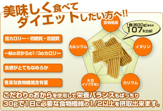 おから(国内製造)・チコリ抽出物・低トランスマーガリン・還元麦芽糖・難消化性デキストリン・太白ごま油・ラカンカ抽出物