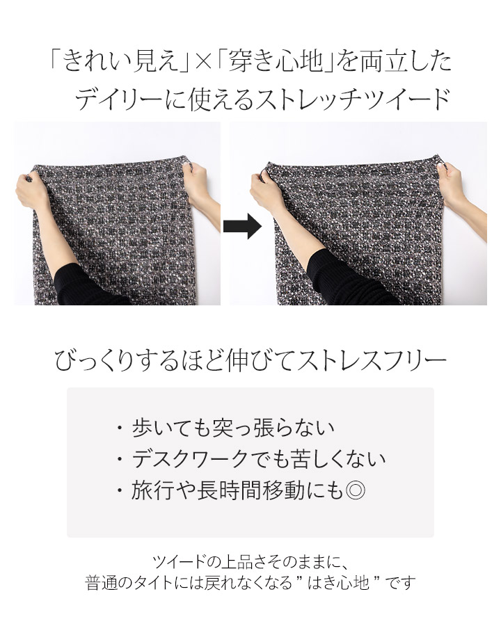 ウエストの幅広ゴムがしっかりしているため、穿くときに少しキツく感じますが、ヒップを通過すると快適で苦しさはありません。ツイードと言えば伸びないイメージだったので、ストレッチ素材なのが動きやすくて嬉しい♪