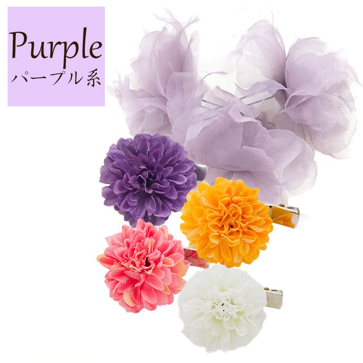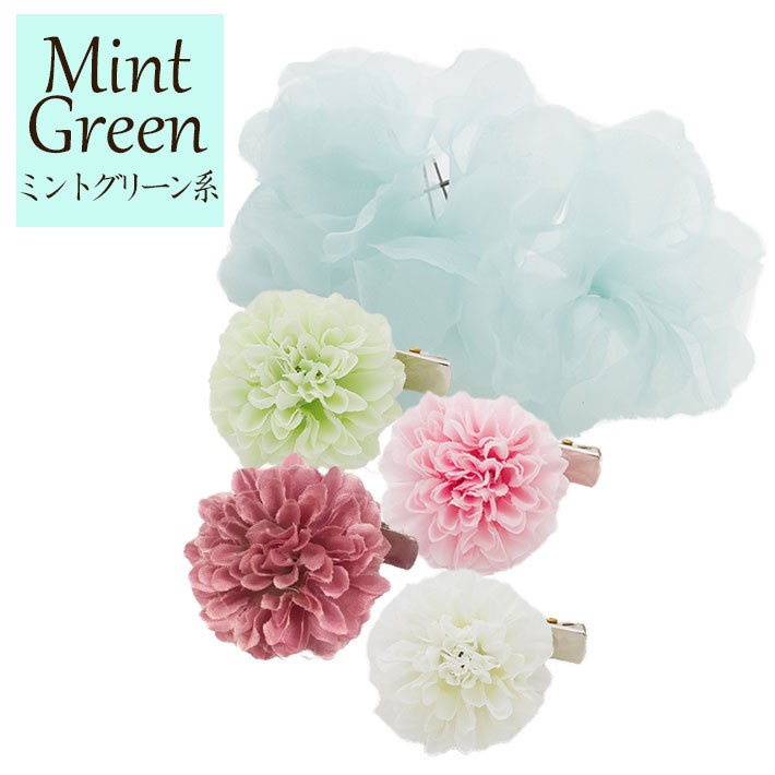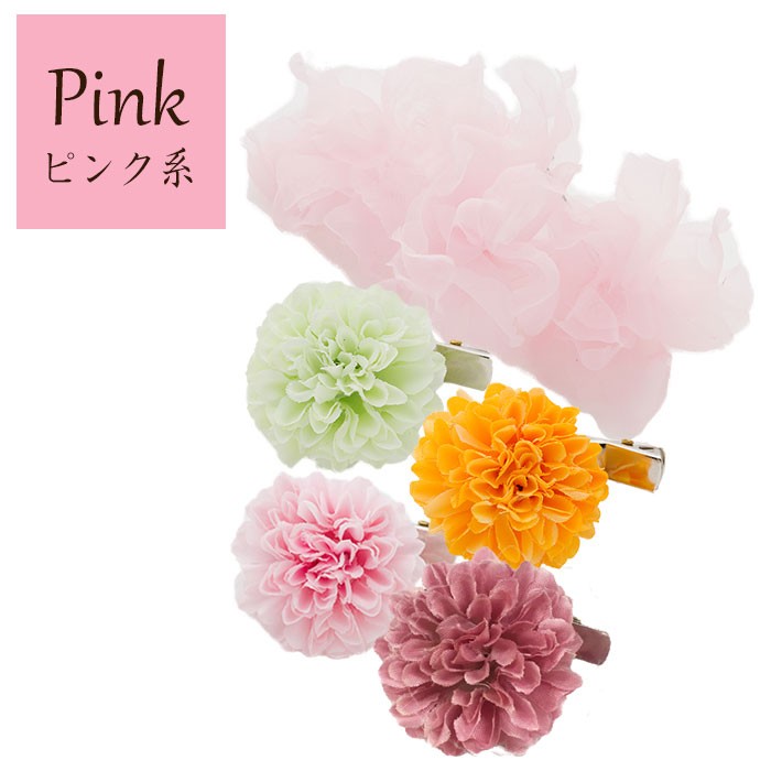 ミニボールマムのクリップ4個とオーガンジーのUピン3本を使い七五三などにピッタリの華やかな組み合わせとなっています。