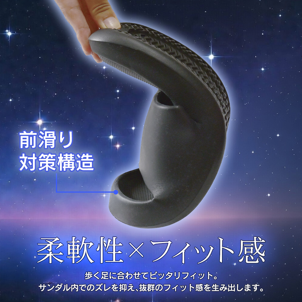 前滑り対策構造:サンダル内でのズレを抑え、抜群のフィット感を生み出します。