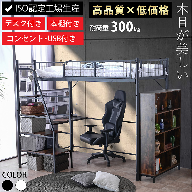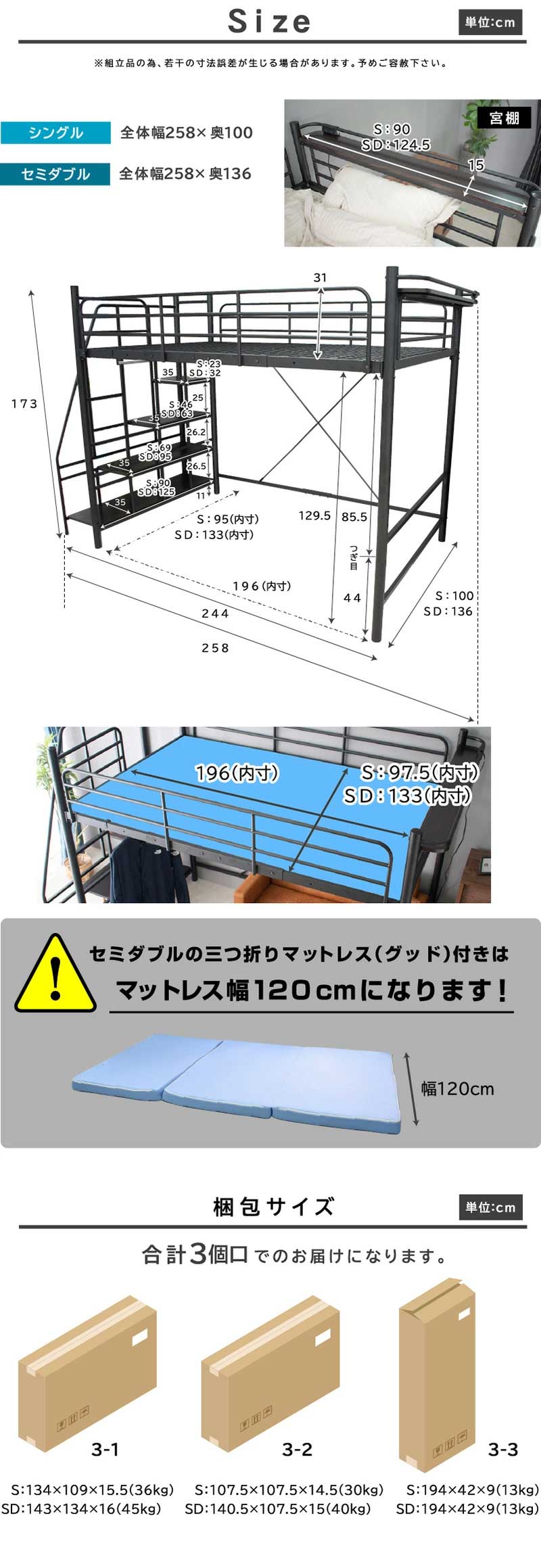 高品質低価格 ロフトベッド ハイタイプ パイプベッド 階段式 ミドル セミダブル 耐荷重300kg 宮棚 コンセント 子供 大人用 階段式ムーンEX (エアーアート付)