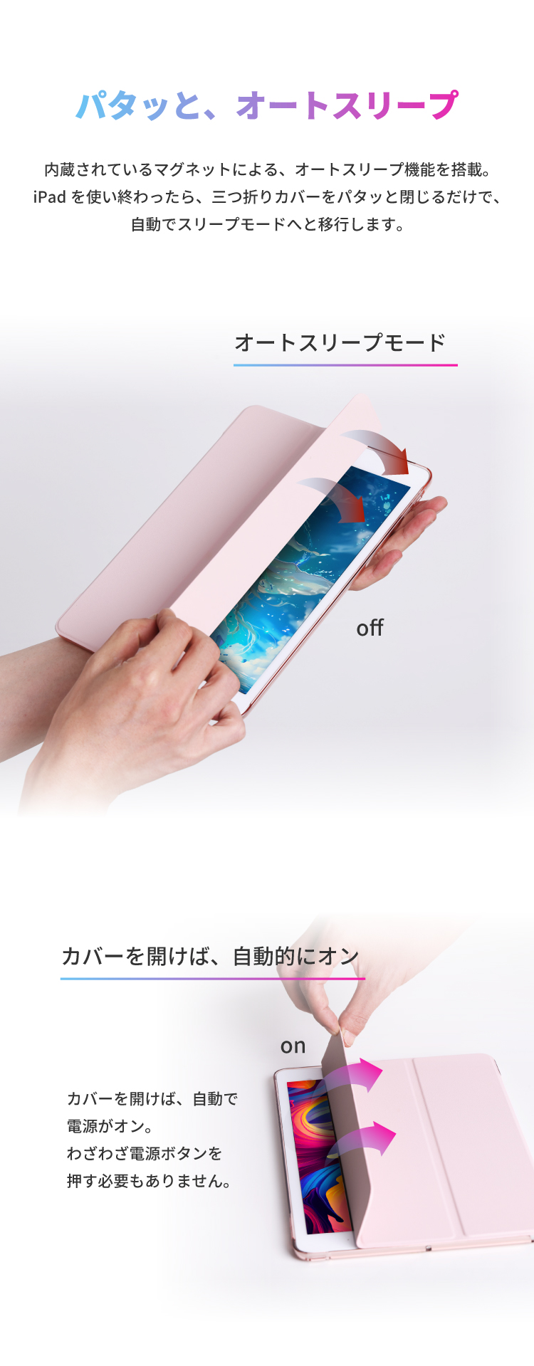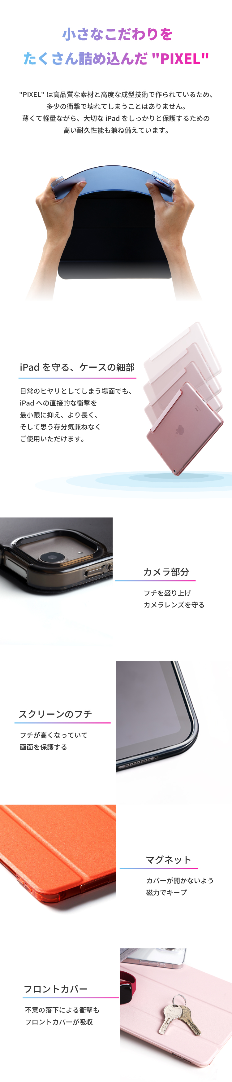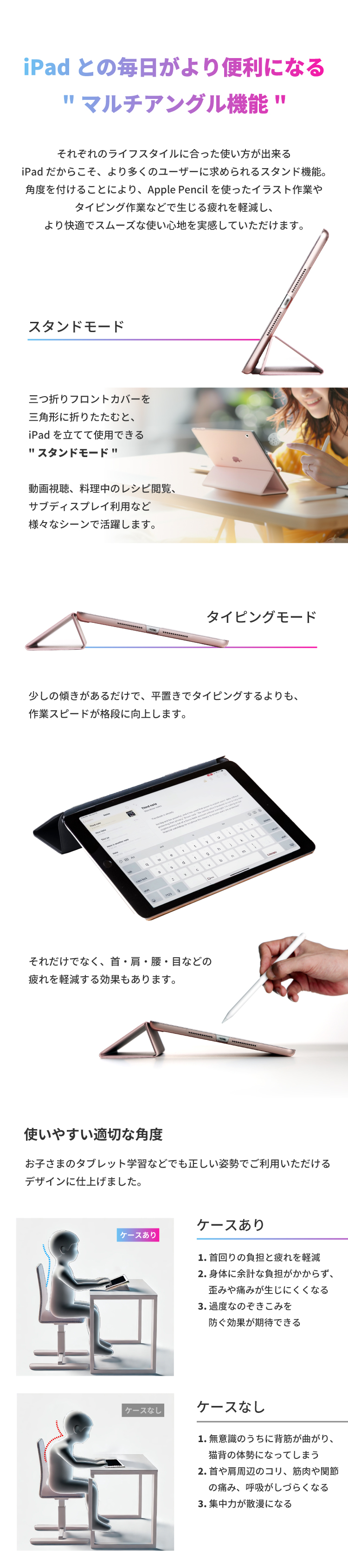フロントカバーに内蔵された複数のマグネットにより、タイピングや動画視聴などiPadを立ててご使用の際、安定したスタンド機能をご利用いただけます。