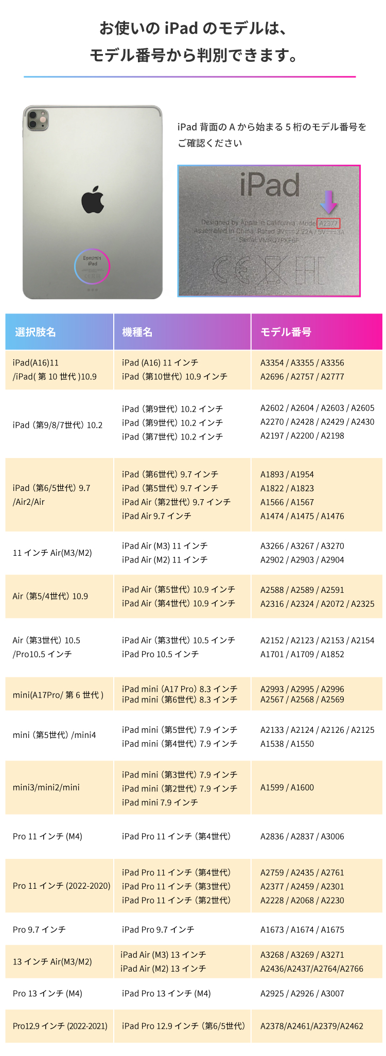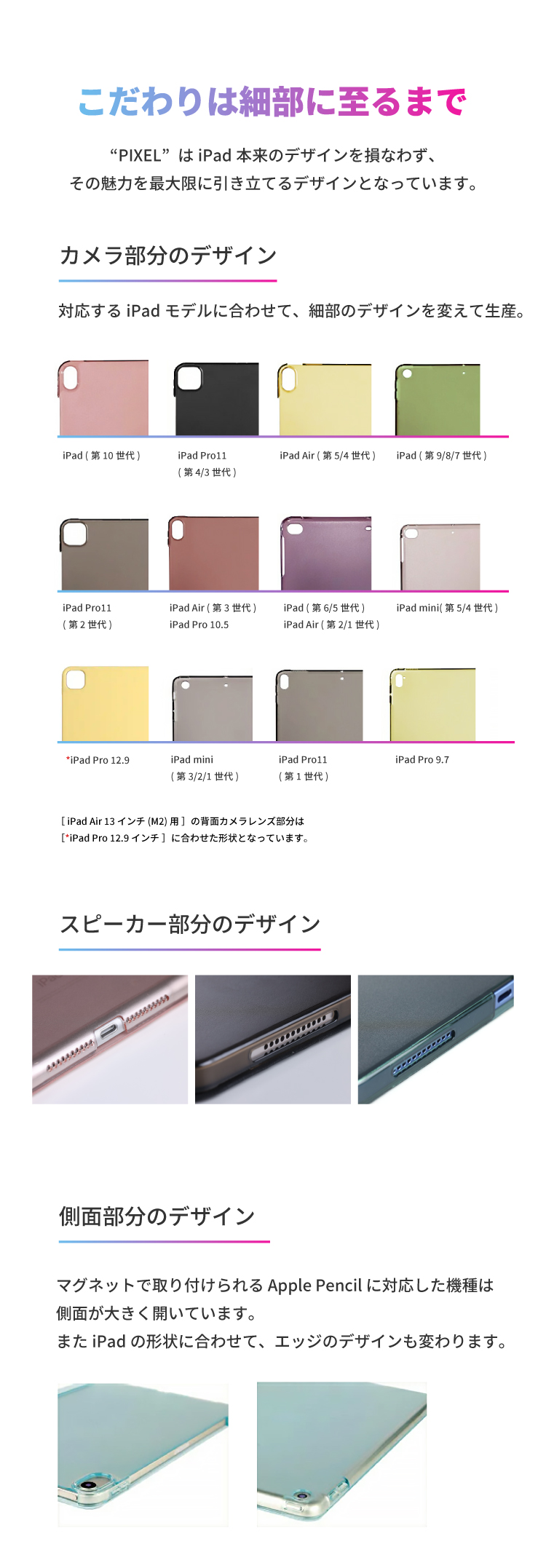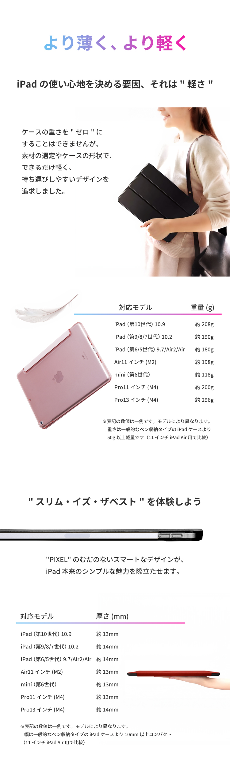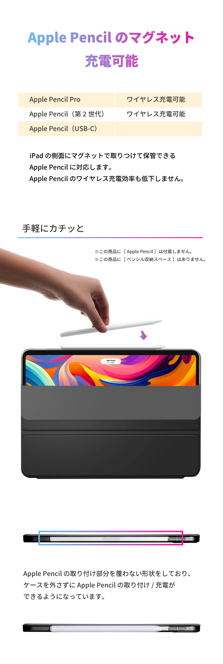フロントカバーに内蔵された複数のマグネットにより、タイピングや動画視聴などiPadを立ててご使用の際、安定したスタンド機能をご利用いただけます。