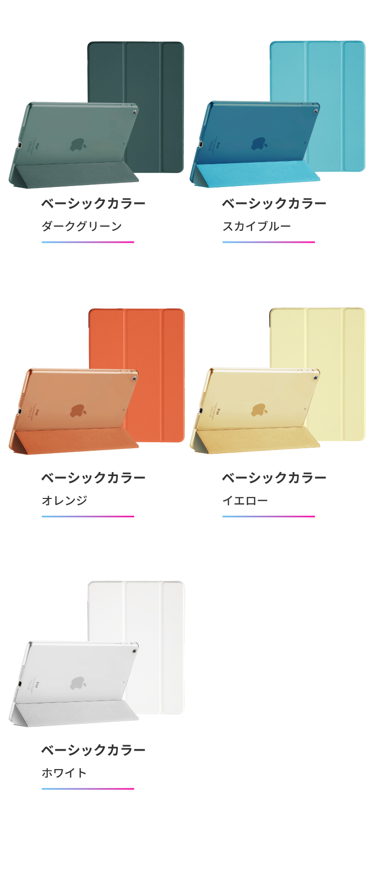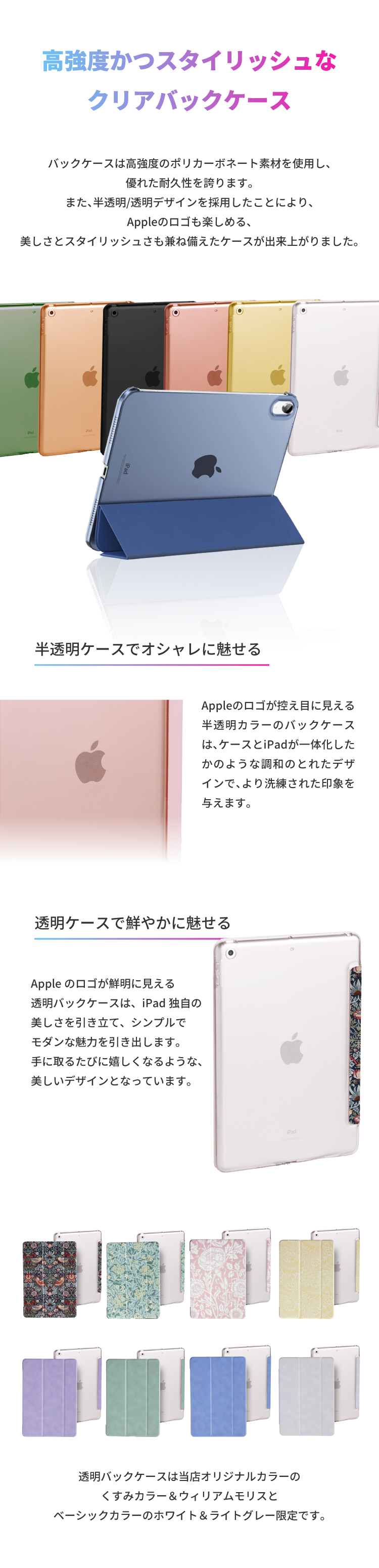 半透明バックケースは、三つ折フロントカバーと同じ色合いの半透明色で「Appleマーク」が透けて見えます。