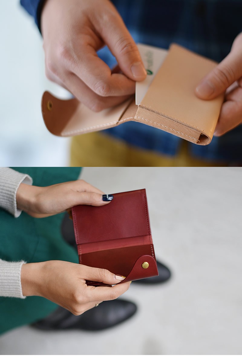 ●シンプルで品のある革は大人で誠実な印象を与え、特に使用頻度の高いビジネスシーンにおいて名刺を交換する際に上司や取引先の方にも好印象を与えてくれる落ち着いたデザインが魅力。