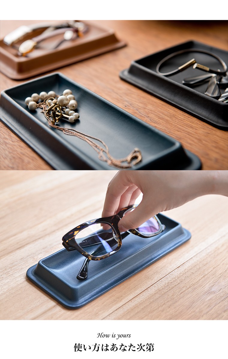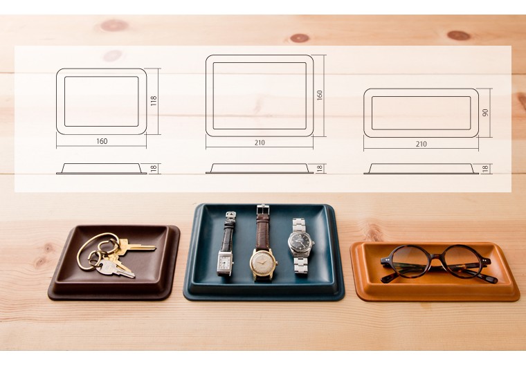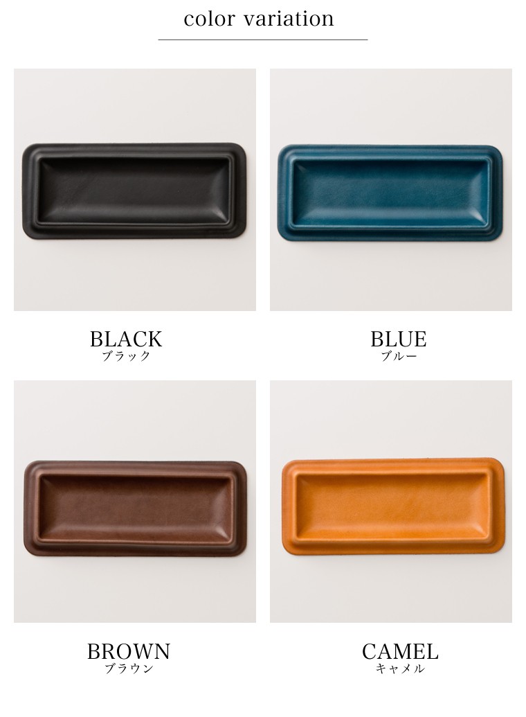 仕事用に、ちょっといいボールペンを買ってみた。普通のペン入れにいれるはちょっともったいないな…。お気に入りのものだから傷を付けたくないけれど、でも毎日使うものだからすぐに取り出せるところに置きたい。このレザートレイはその想いを汲み取ったアイテムです。オールレザーのため、革がやさしく大切な物を受け止め代わりに傷を「負って」くれます。そしてそれは、時間と共に深い「味わい」に変化していくのです。また、伝統的技法と現代の技術の融合から生まれた立体的なデザインは、物を取るときに絶妙なカーブで助けてくれます。トレイの大きさは210mm×90mm。ペンやアクセサリーなど、入れるものは多種多様。レザーのシンプルさが使うシーンを選びません。また高級感も与えてくれるためインテリアとしても最適。自分と自分の相棒の休憩場所になるトレイです。