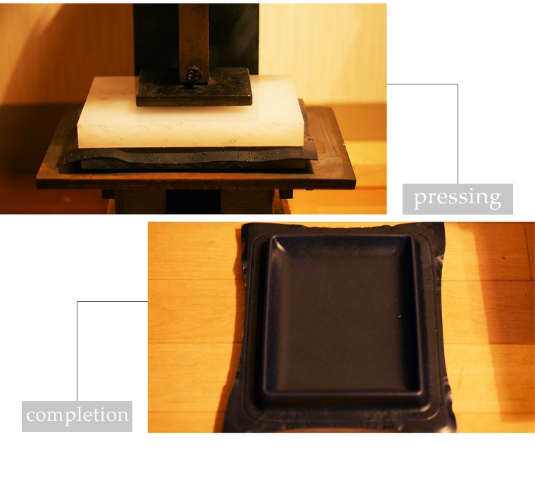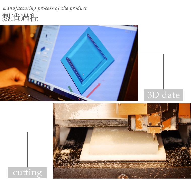 ヌメ革は水で湿らせて、型にはめてプレスすることでより機能的により美しく自由にカタチを変えます。この革絞りという古くから伝わる伝統的技法で、中々精密な形を作り出すことは難しいです。そこで3データを制作しCNC(自動フライス盤)によって型を切削することで複雑で精密な立体成型を可能にしました。伝統技術と現代技術の融合が作り上げたトレイの美しいフォルムに見とれてしまいます。