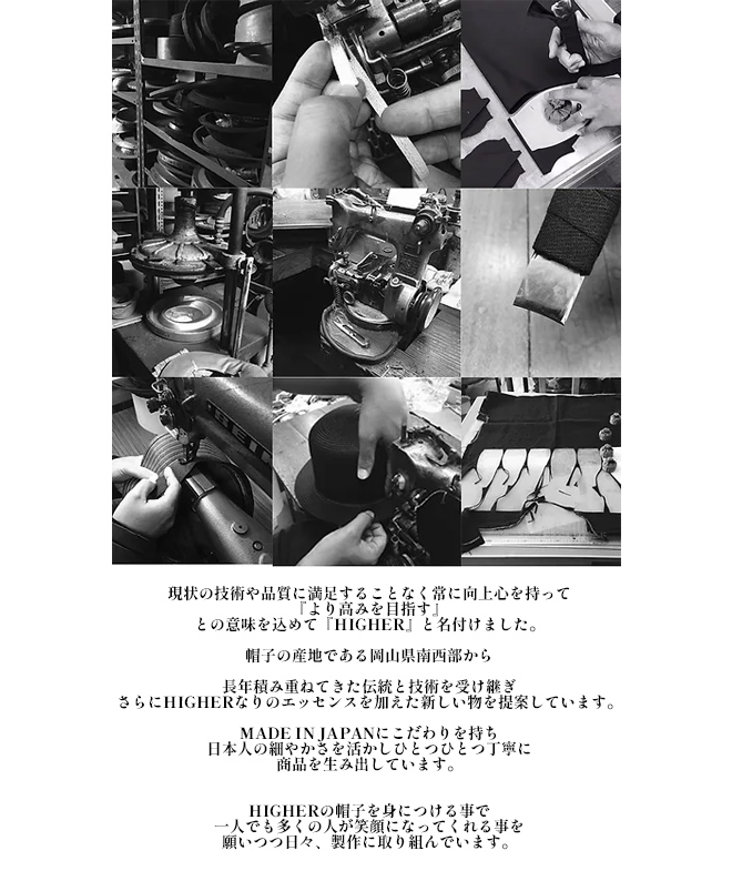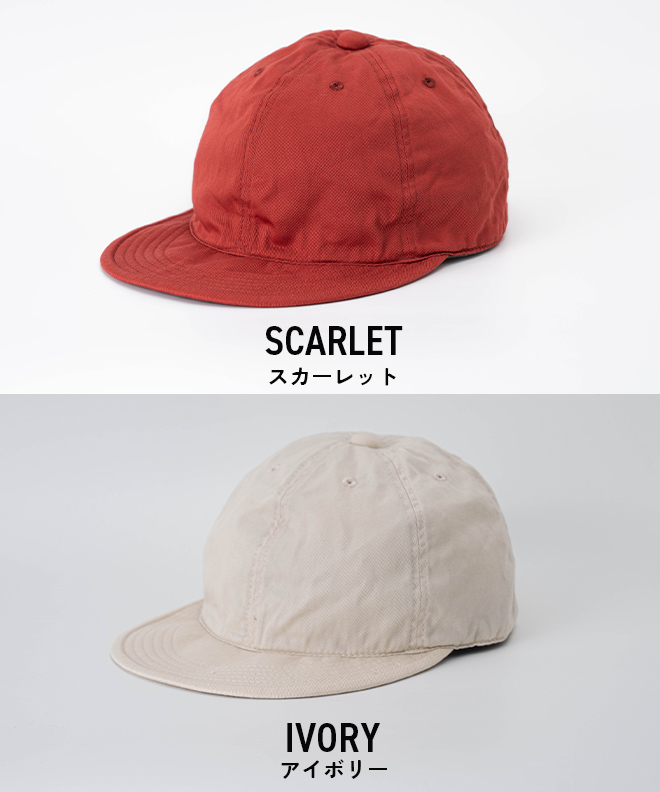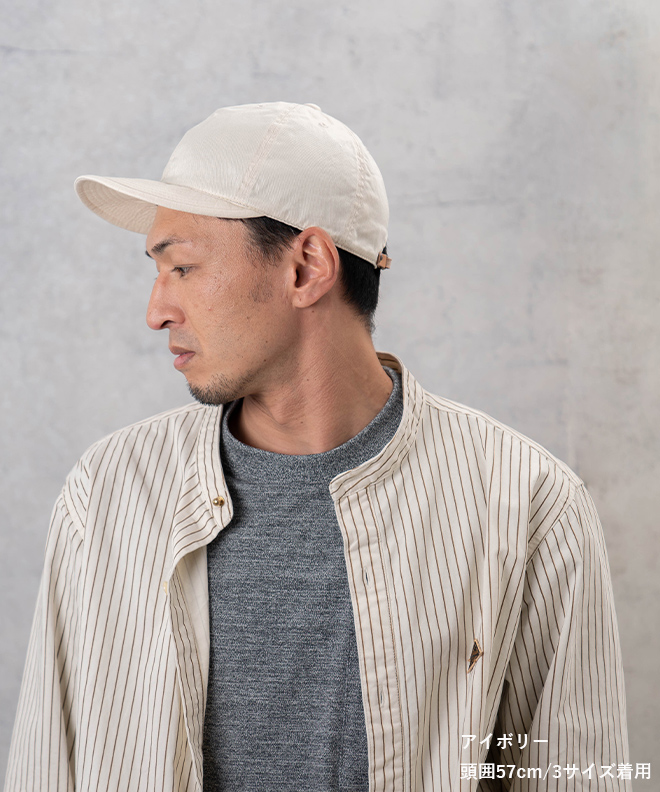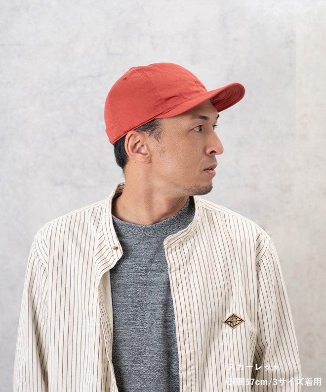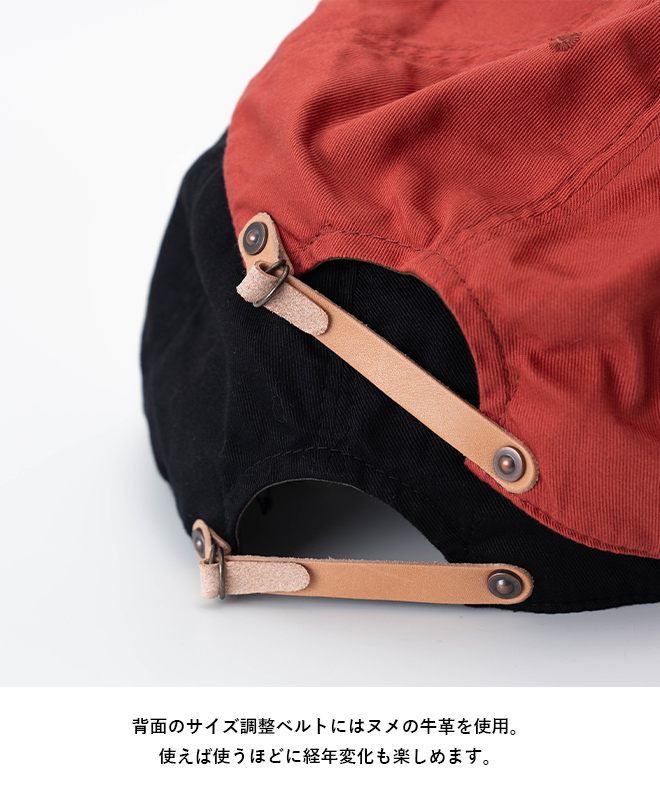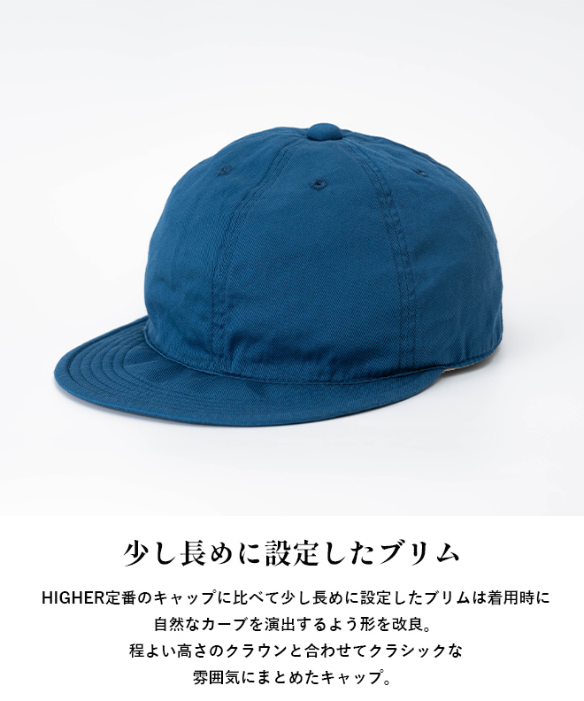 HIGHER定番のキャップに比べて少し長めに設定したブリムは着用時に自然なカーブを演出するよう形を改良。程よい高さのクラウンと合わせてクラシックな雰囲気にまとめたキャップ。背面のサイス?調整ヘ?ルトにはヌメの牛革を使用。