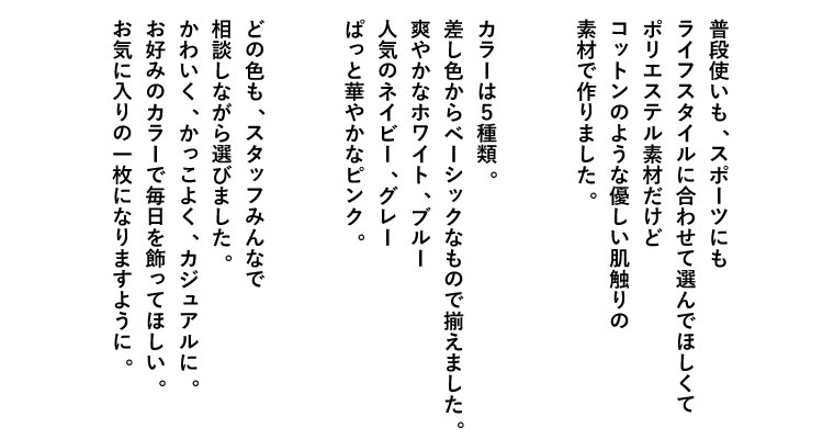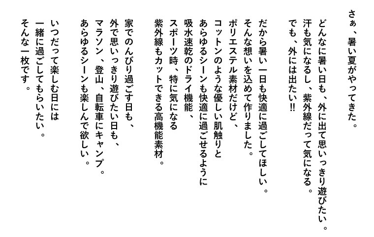 ●ポリエステル素材だけど、 コットンのような優しい肌触りとあらゆるシーンも快適に過ごせるように吸水速乾のドライ機能、スポーツ時、特に気になる紫外線もカットできる高機能素材。