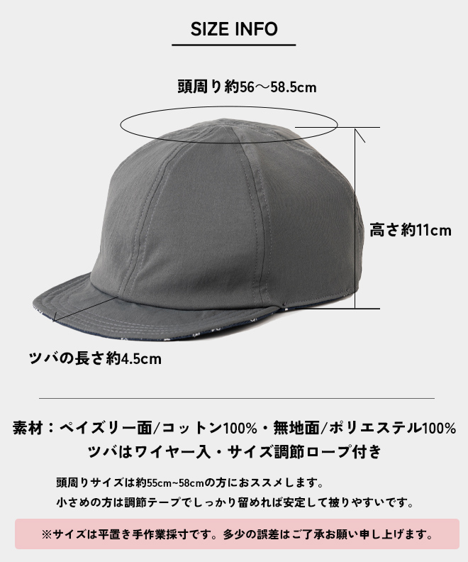 頭周り:約56〜58.5cm ツバの長さ:約4.5cm 高さ:約11cm