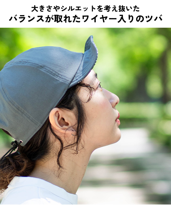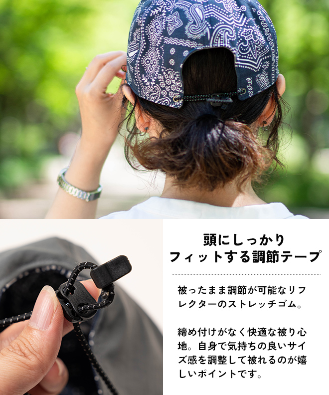 調節テープはリフレクターのストレッチゴムになっており、締め付けが無く快適に被って頂けます。